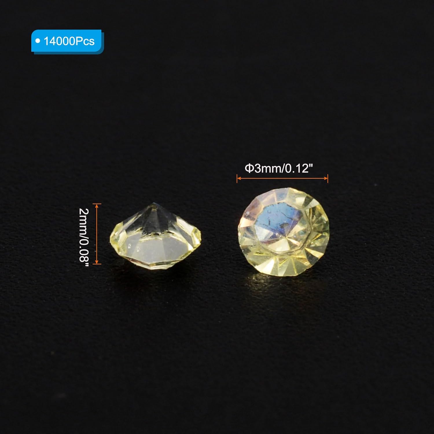 • Color: Light Yellow AB; Material: Acrylic; Size: 3mm x 2mm/ 0.12 x 0.08 inch (Dia.x H); Packing List: 14000Pcs x Acrylic crystal diamonds