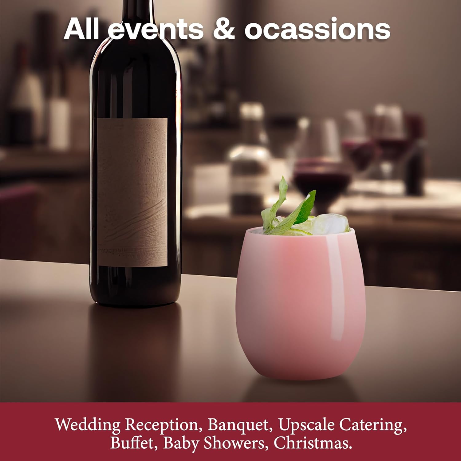 • STYLISH & CHIC DESIGN: Elevate events effortlessly using this elegant solid pink stemless wine glass set, bringing upscale aesthetics and trendy disposable drinkware to celebrations.