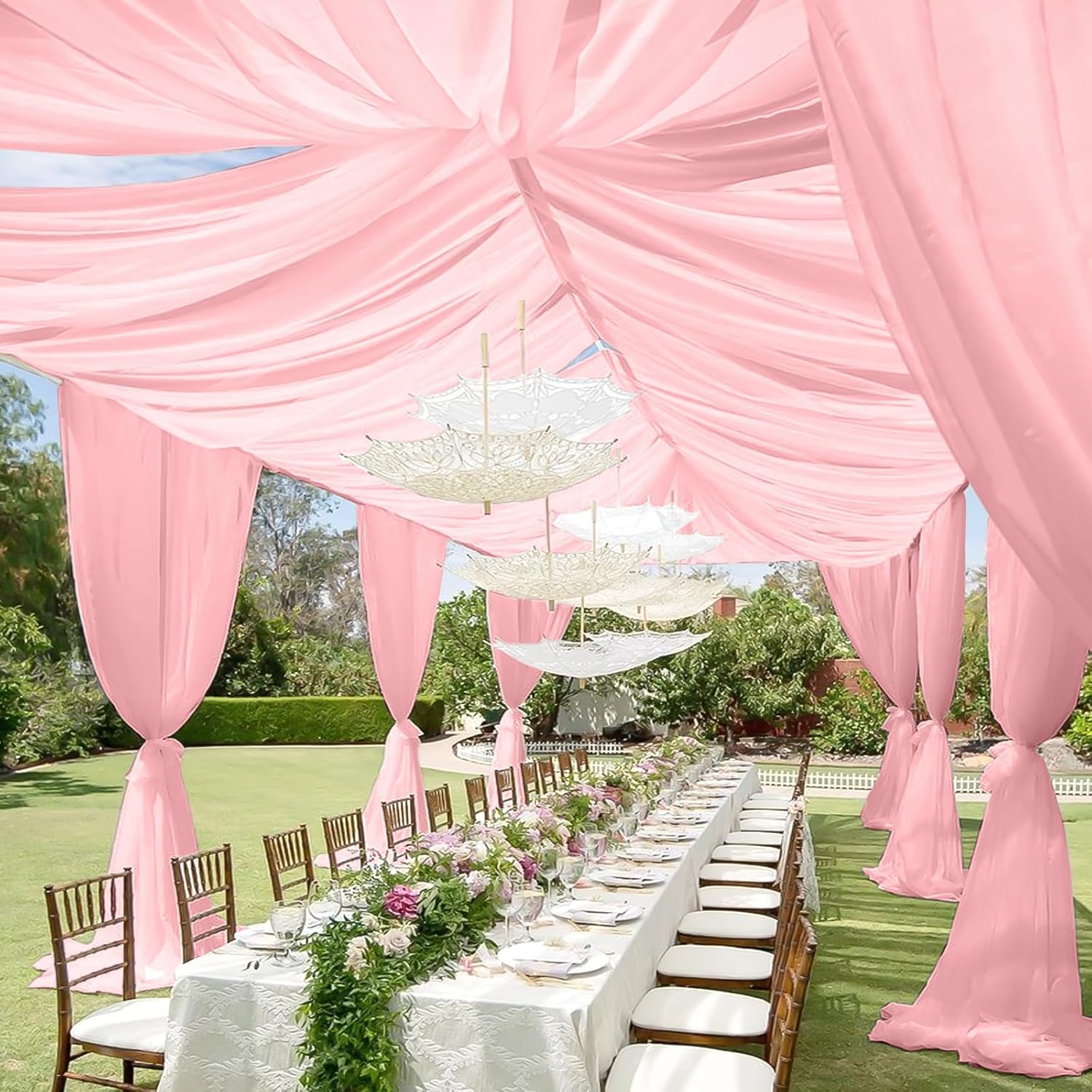• 🌷【Wedding Ceiling Curtain Widely Used】Wedding drapery ceiling can match well with many decorations, perfect for weddings ceiling, stages, receptions, parties, bridal and baby showers, birthdays, engagement, candy buffets, dessert tables, photography, ceremony and more. The sheer curtain can not only decorate the ceiling but also your arches, backdrop, curtains, chandeliers and so on.