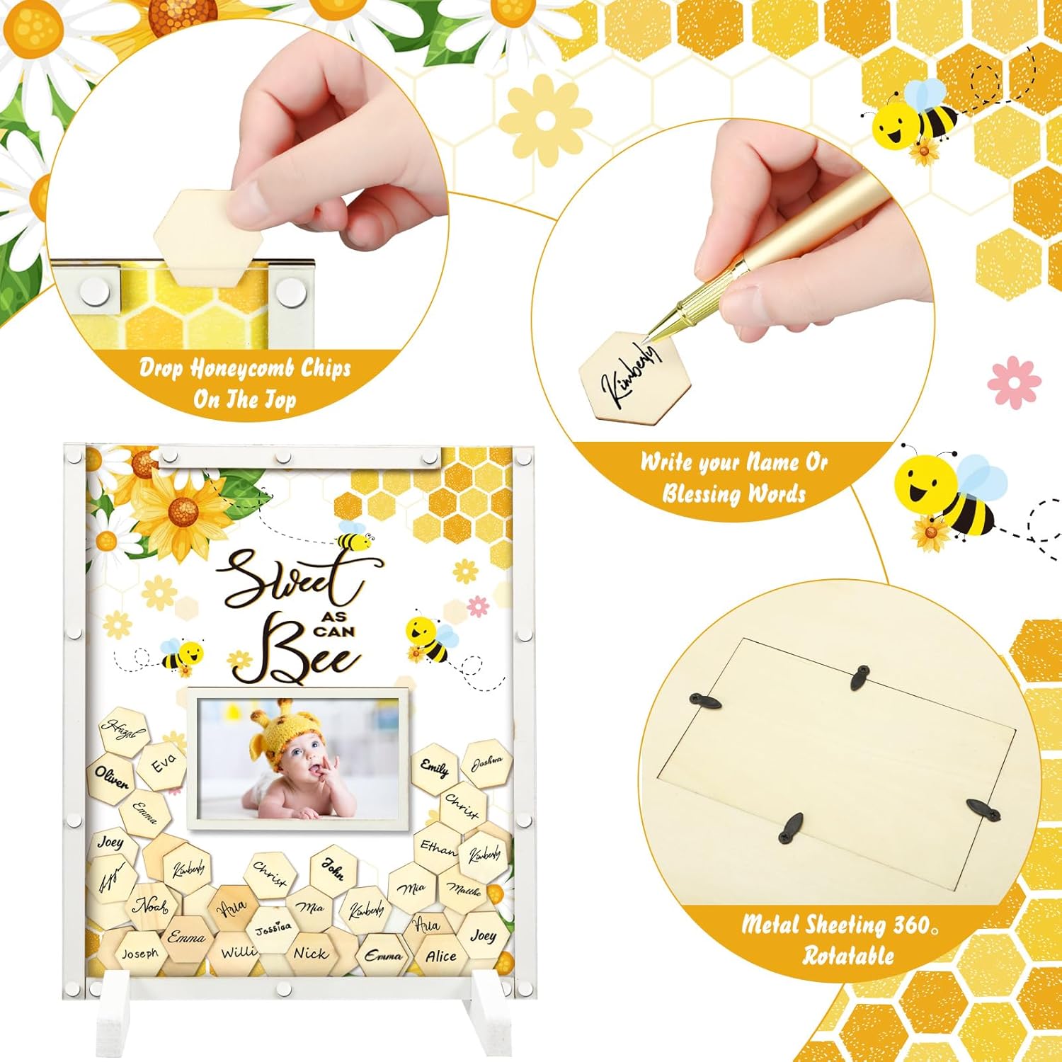 • Bee Baby Shower Decorations: you will receive a bee theme baby shower guest book with photo frame in 11.81 x 13.78 inches/ 30 x 35 cm, a pen, 60 honeycomb wood cutouts, 1 organza bag, 2 display shelves, enough to meet the needs of your bee themed baby shower party