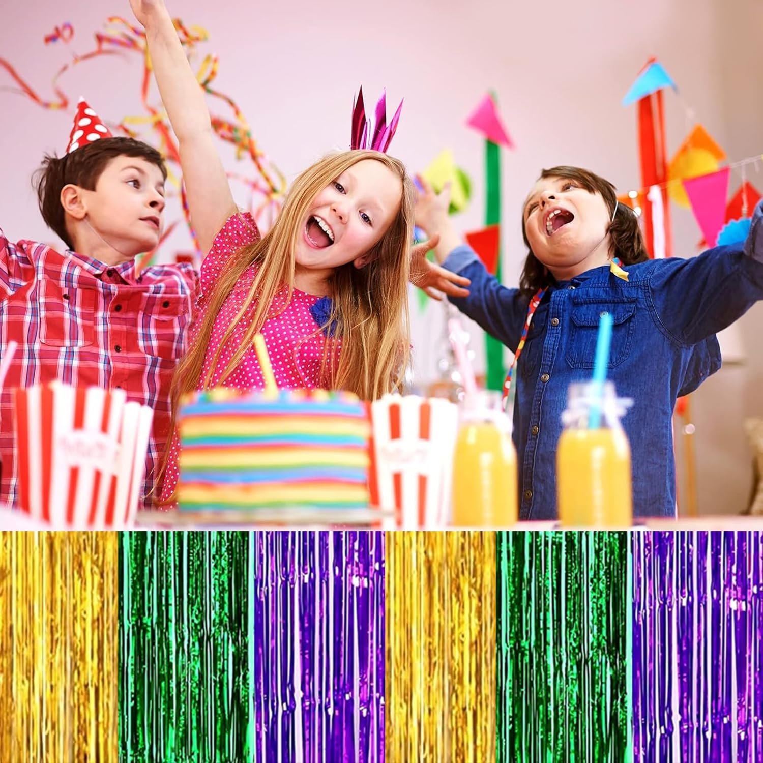4P Metallic Foil Fringe Tinsel Table Skirts for Rectangle Tables Backdrop Banner Streamer Garland Curtains Parade Floats Wedding Graduation Anniversary Birthday Parties Decoration (Gold Green Purple)