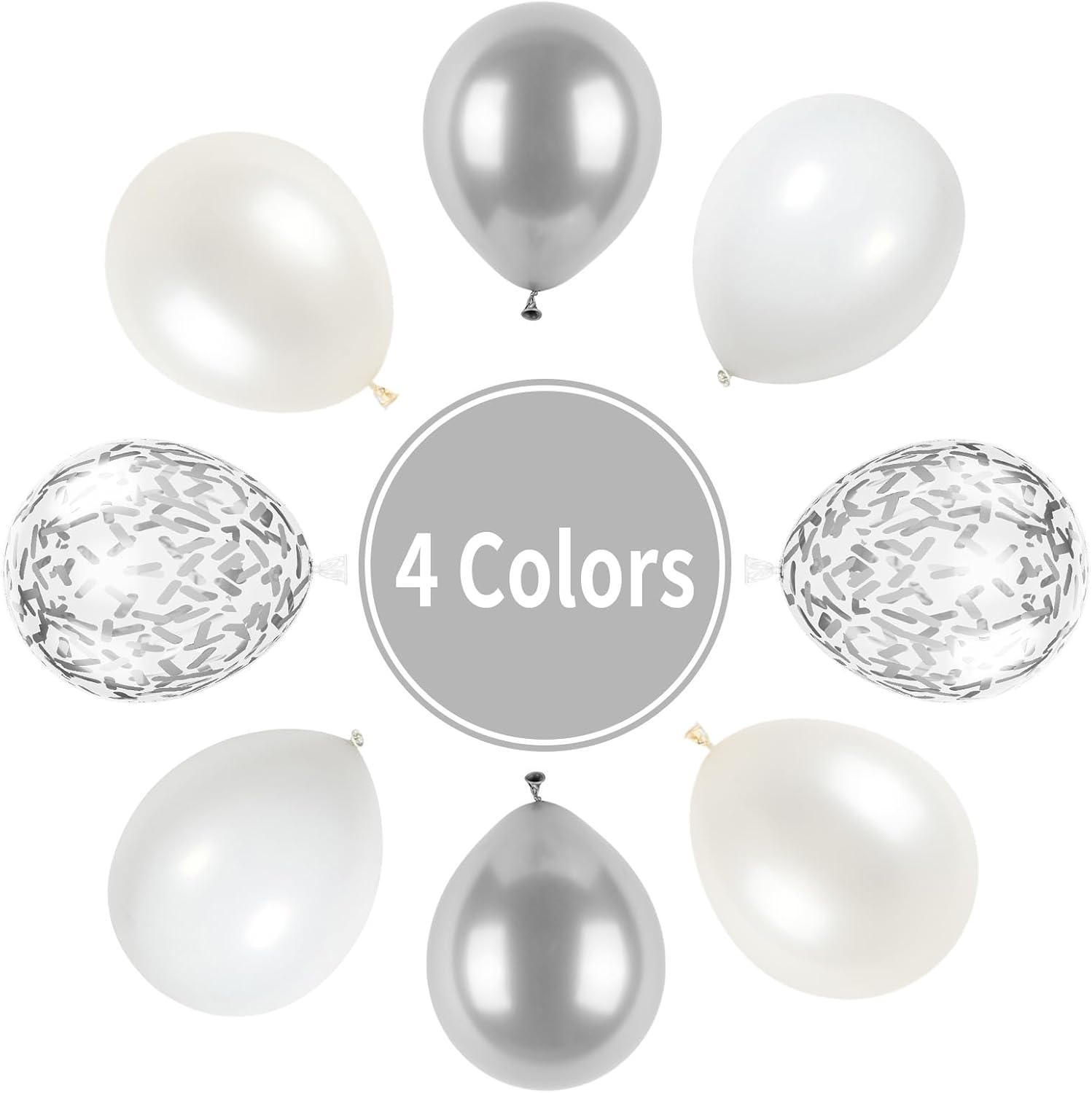 • 【12Inch Party Balloons Set】: The white and silver balloons set includes 20pcs matte white balloons, 15pcs pearl white balloons, 10pcs metallic silver balloons, 15pcs silver confetti balloons, 1pc silver ribbon. 61pcs in total. Elevate your celebrations with our birthday party balloons!