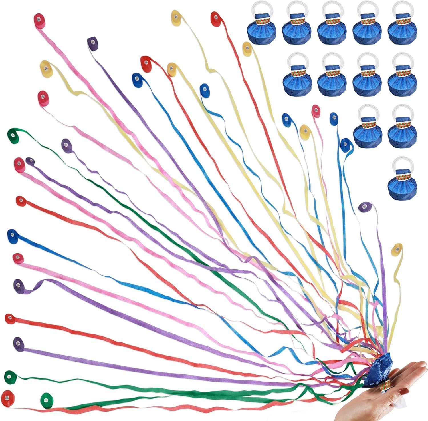 • 50Pack/30Ribbons/17FT:Contains 48Pack Colorful confetti poppers.Each party poppers ribbons with a total of 30 thin ribbons,the length can reach 17FT, invite guests to throw ribbons together!