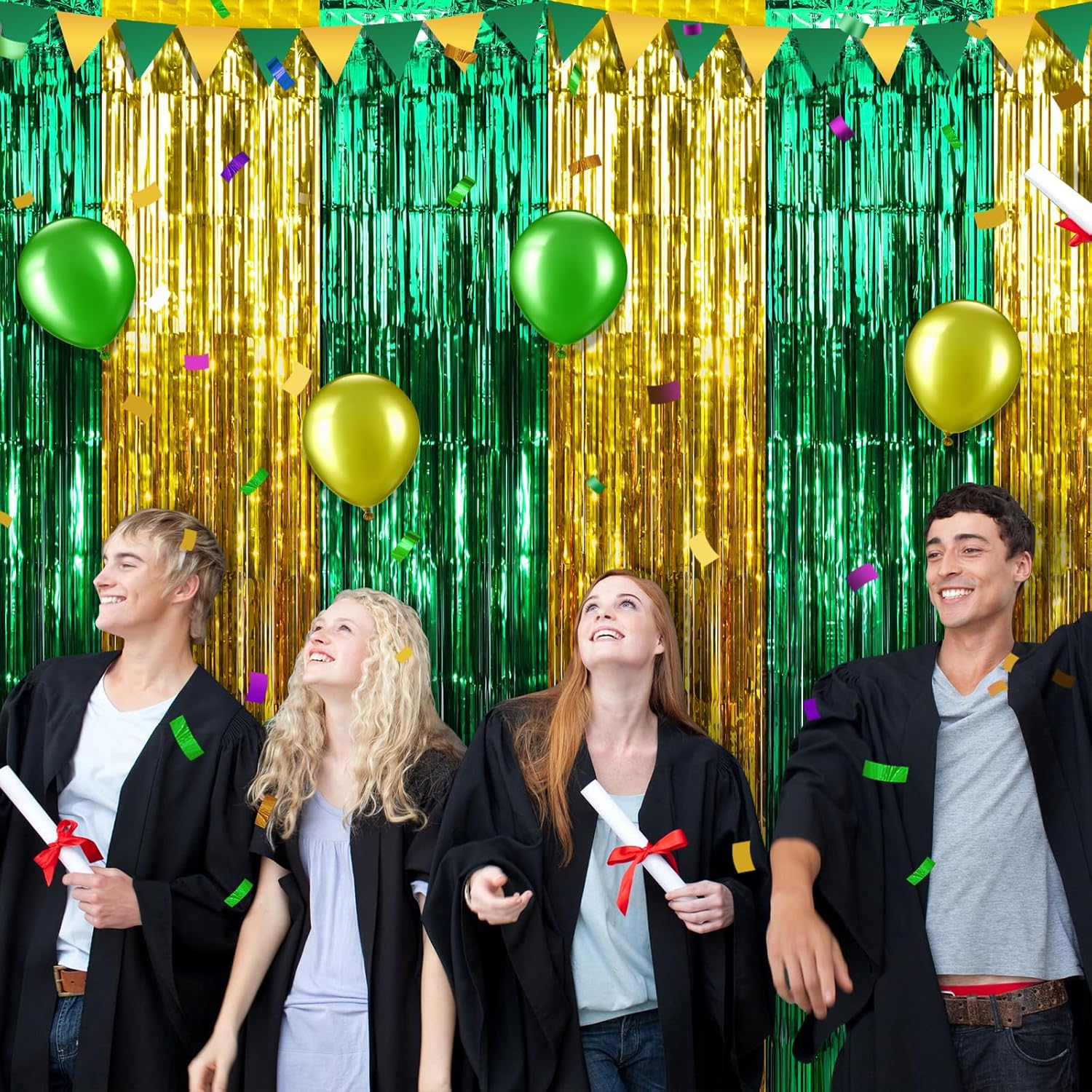 3Pack 3.3Ft x 6.6Ft Graduation Foil Fringe Curtain Backdrop Decorations, Green Gold Metallic Tinsel Foil Streamers Curtain Photo Booth Background for Graduation Prom Wedding Birthday Party Decoration