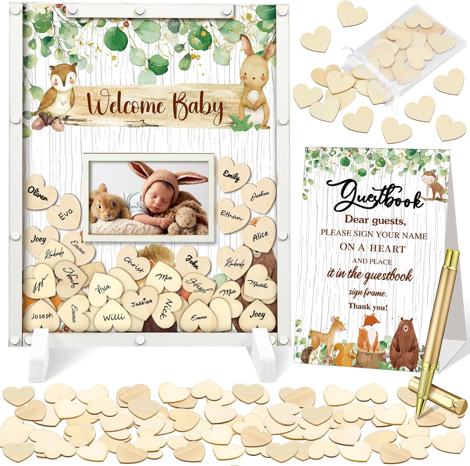 • Woodland Animal Baby Shower Decorations: you will receive a woodland animal theme baby shower guest book with photo frame in 11.81 x 13.78 inches/ 30 x 35 cm, a pen, 60 woodland animal wood cutouts, 1 organza bag, 2 display shelves, enough to meet the needs of your woodland animal themed baby shower party