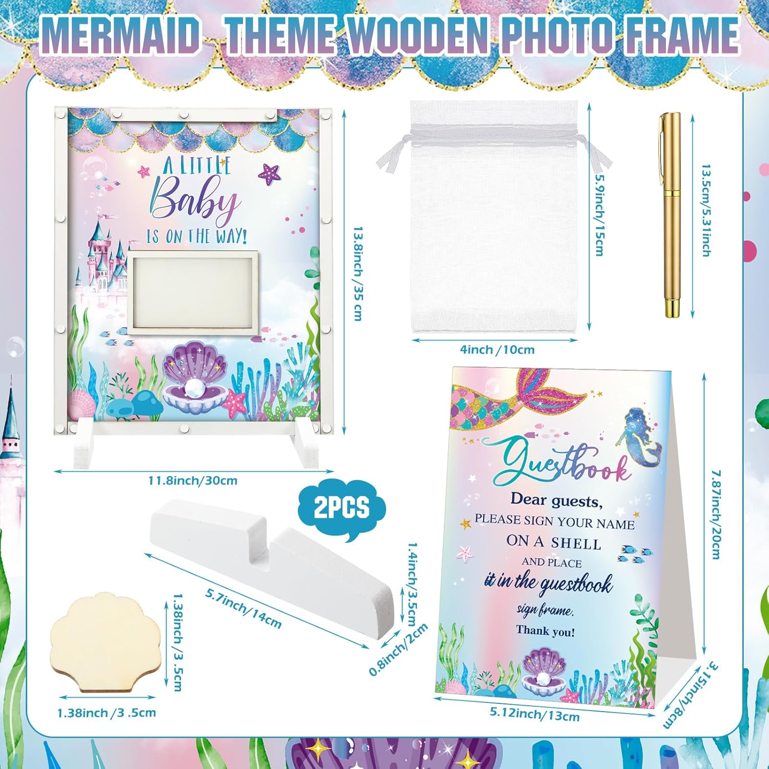 • Mermaid Baby Shower Decorations: you will receive a mermaid theme baby shower guest book with photo frame in 11.81 x 13.78 inches/ 30 x 35 cm, a pen, 60 mermaid wood cutouts, 1 organza bag, 2 display shelves, enough to meet the needs of your mermaid themed baby shower party