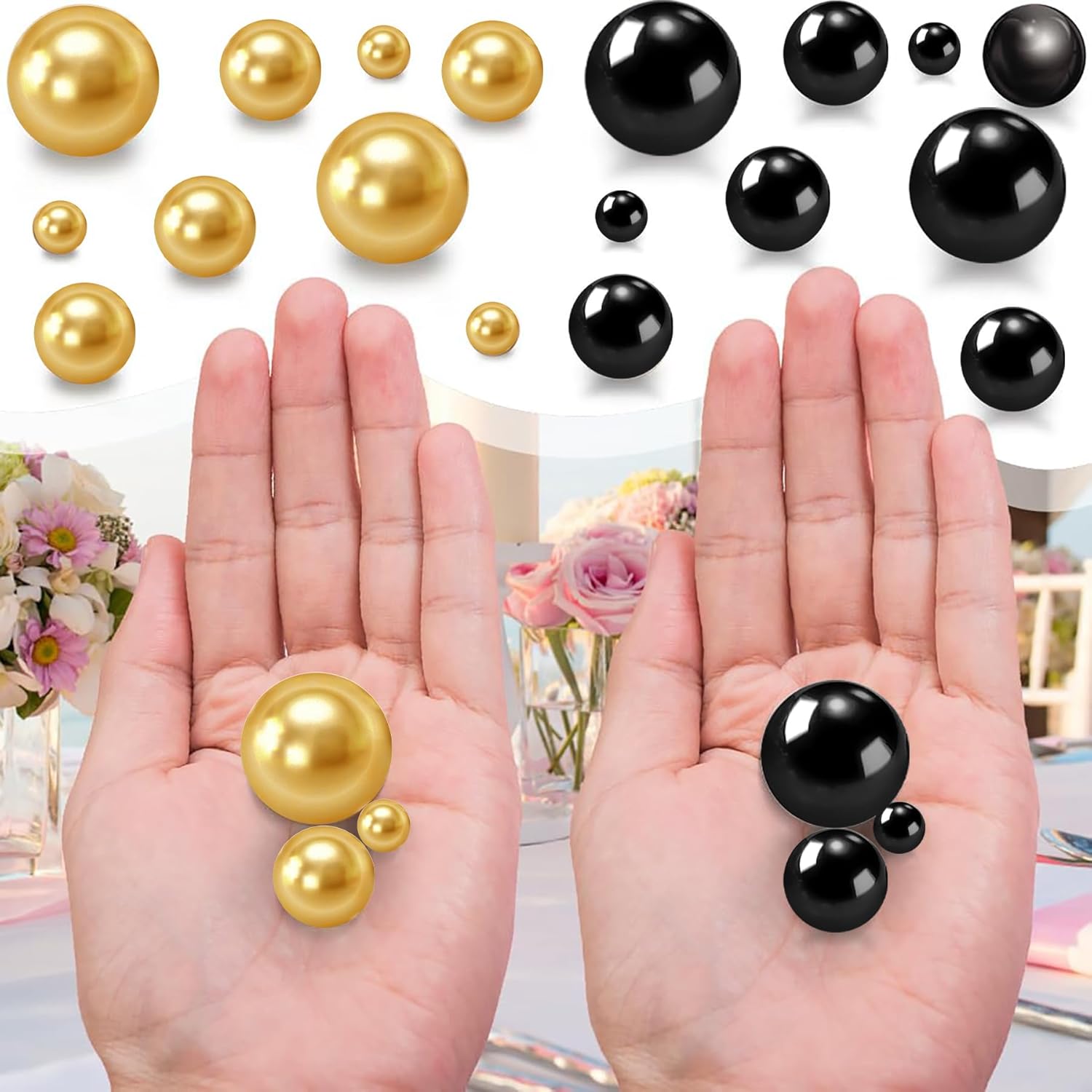 150Pcs Black&Gold Polished No Hole Faux Pearl Beads for Vase Filling Decorations, Plastic Pearls Vase Fillers, Table Scatters, Wedding Centerpiece, Home Decor, 8/14/20 mm