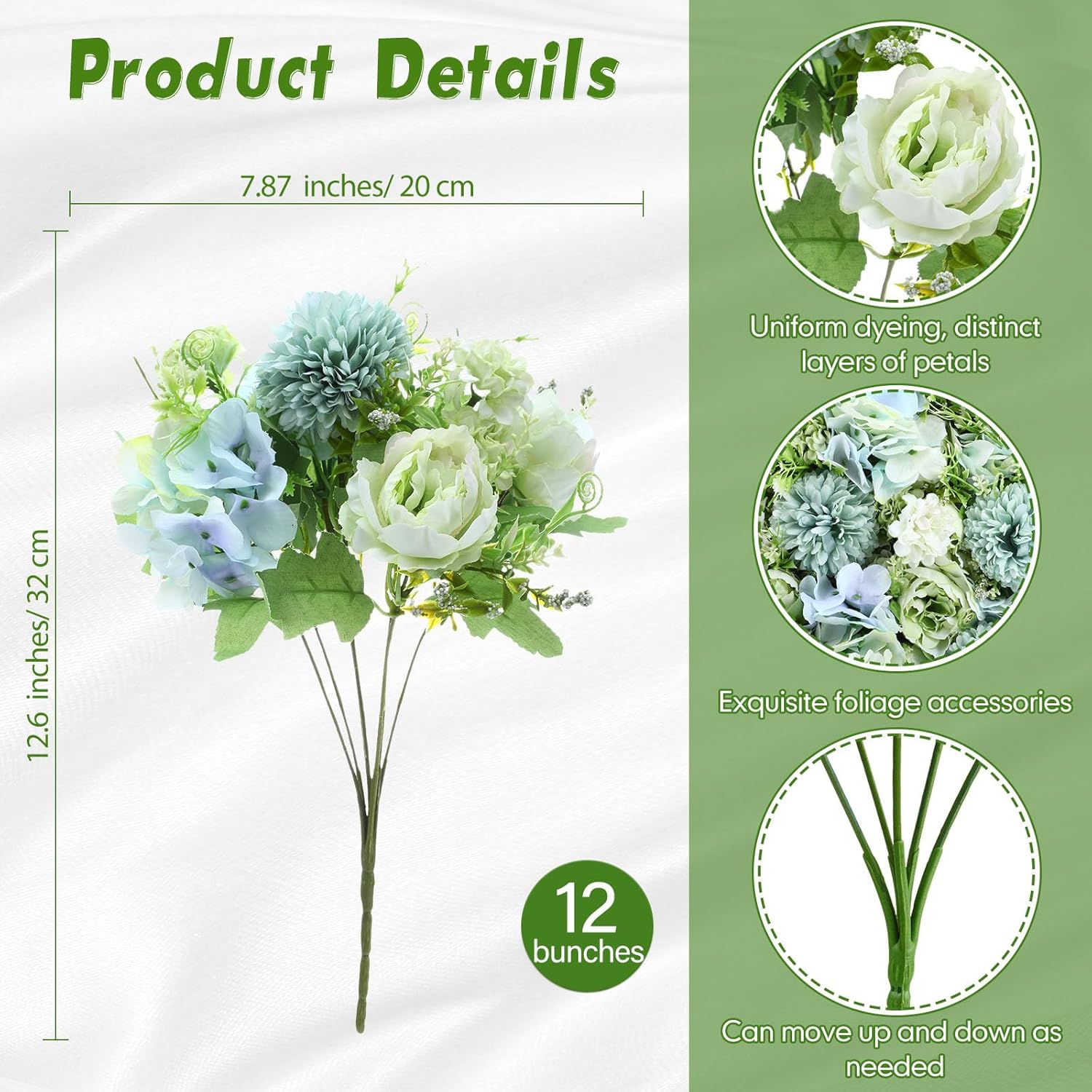 Tigeen Artificial Flowers Artificial Peonies Silk Flowers Faux Peony Fake Peony Silk Hydrangea Bouquet for Wedding Table Centerpiece Floral Vase Decor(White Green,12 Bundles)