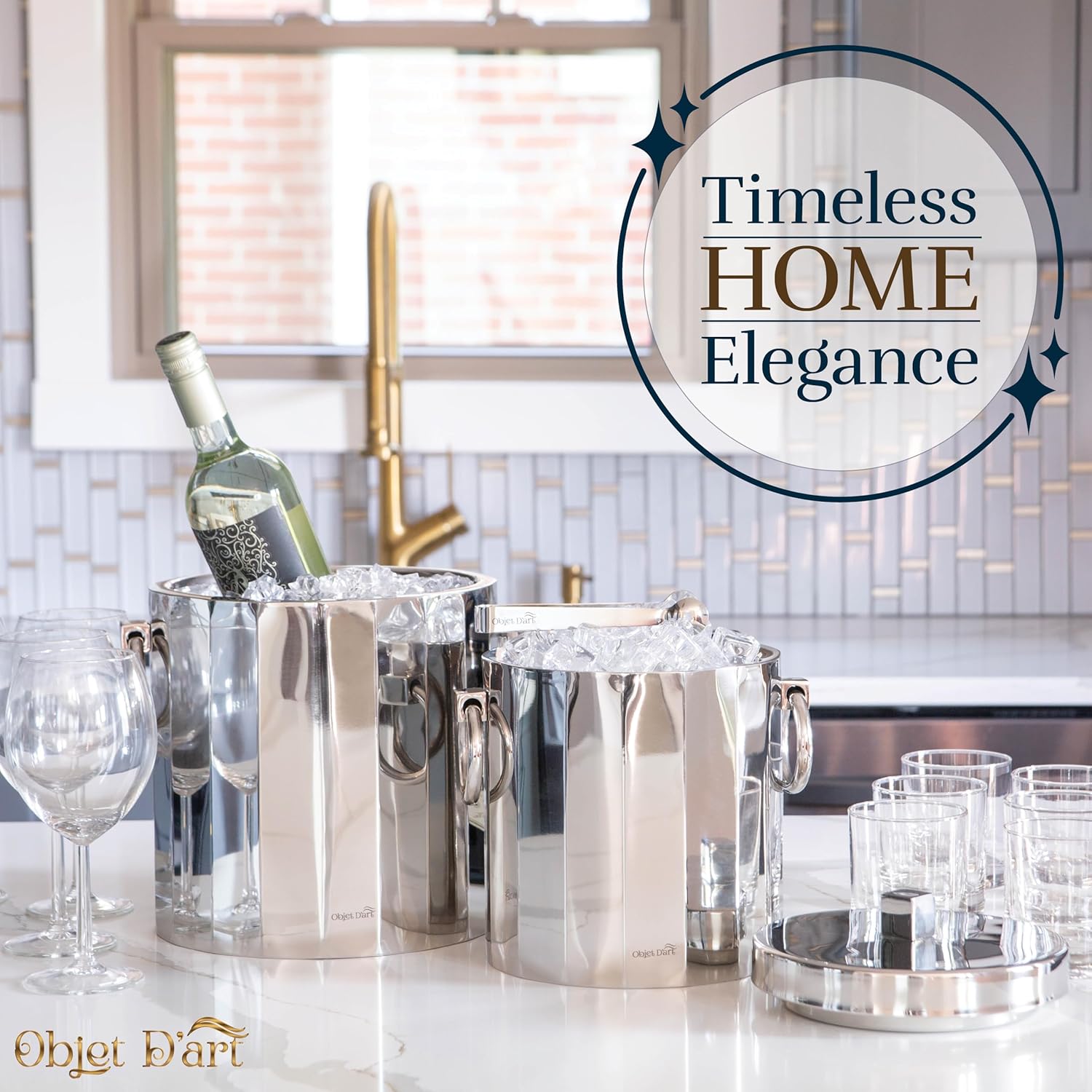 Insulated Ice Bucket for Parties by Objet D’Art, Large Ice Bucket with Scoop Tongs, 2 Stainless Steel Metal Buckets for Party, Double Walled, 2 Liters, Delphi, 7.5 x 9 x 10