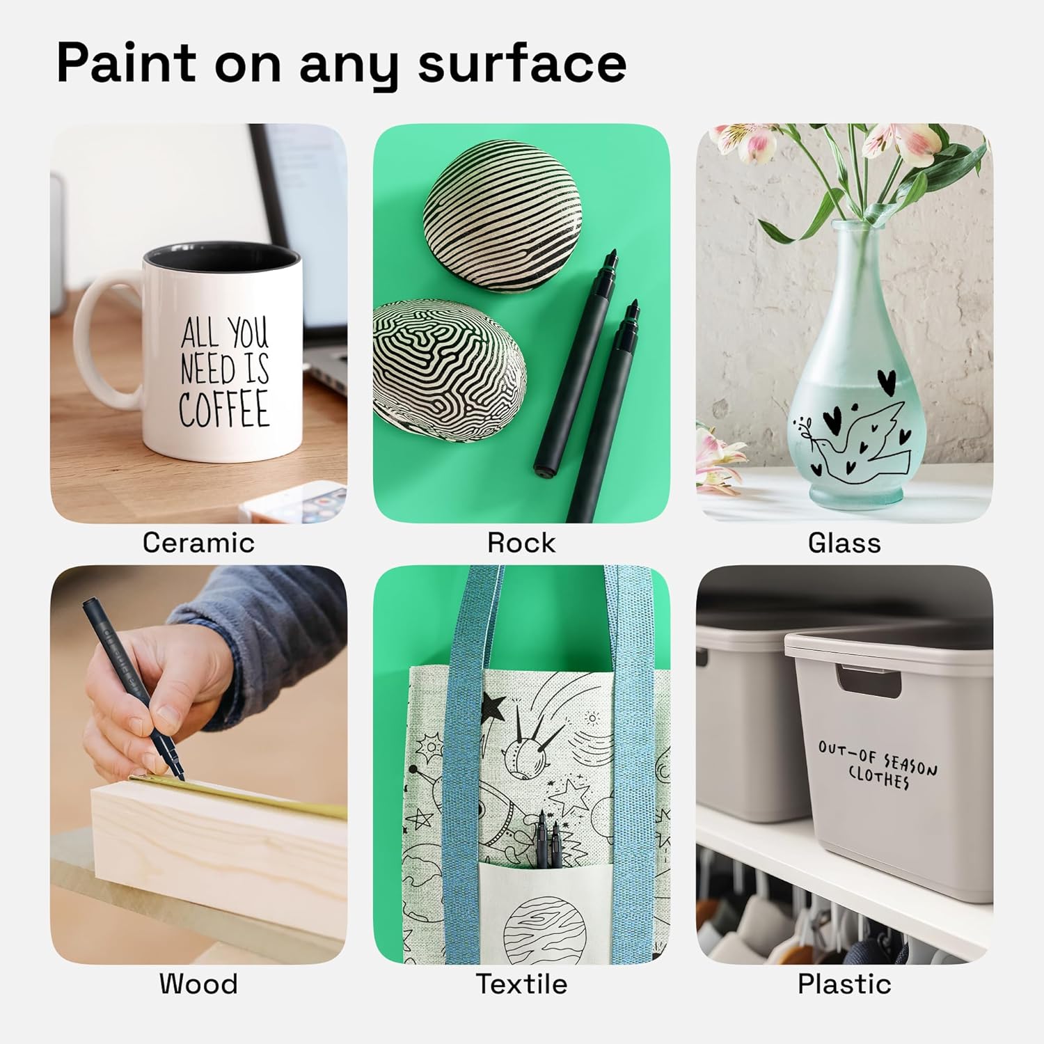 • Multiple Surfaces: Use these oil paint pens as oil markers for plastic and glass or as oil based fabric markers for clothes. Each black pen is water-resistant. They’re also good for leather, vinyl, or epoxy resin. And the nibs are solid, even on rocks!