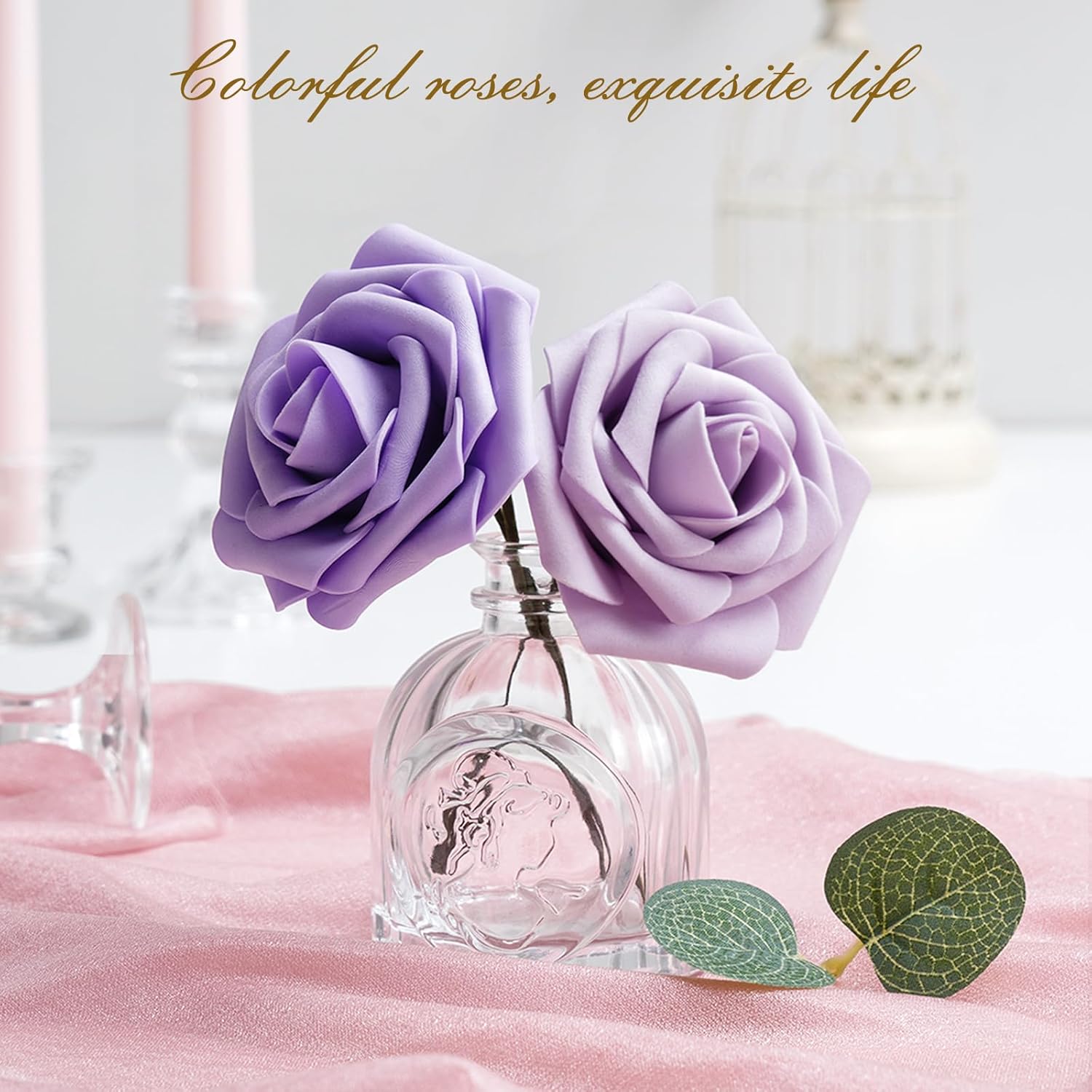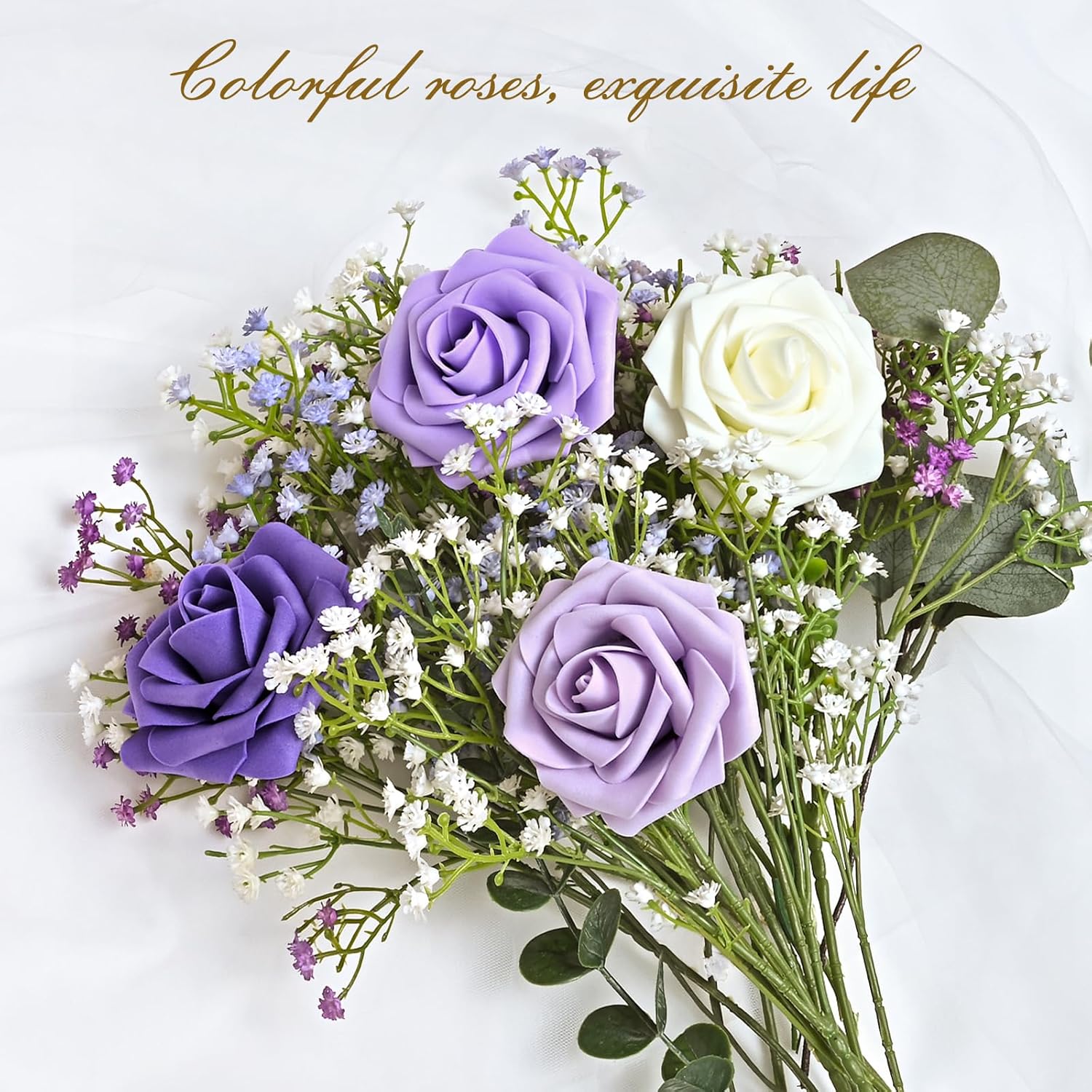 BLEUM CADE 16Pcs Artificial Flowers Fake Roses with Stems, Gradient Purple Boxed Foam Roses for DIY Bouquets Centerpieces Wedding Party Arrangement Bridal Shower Decor