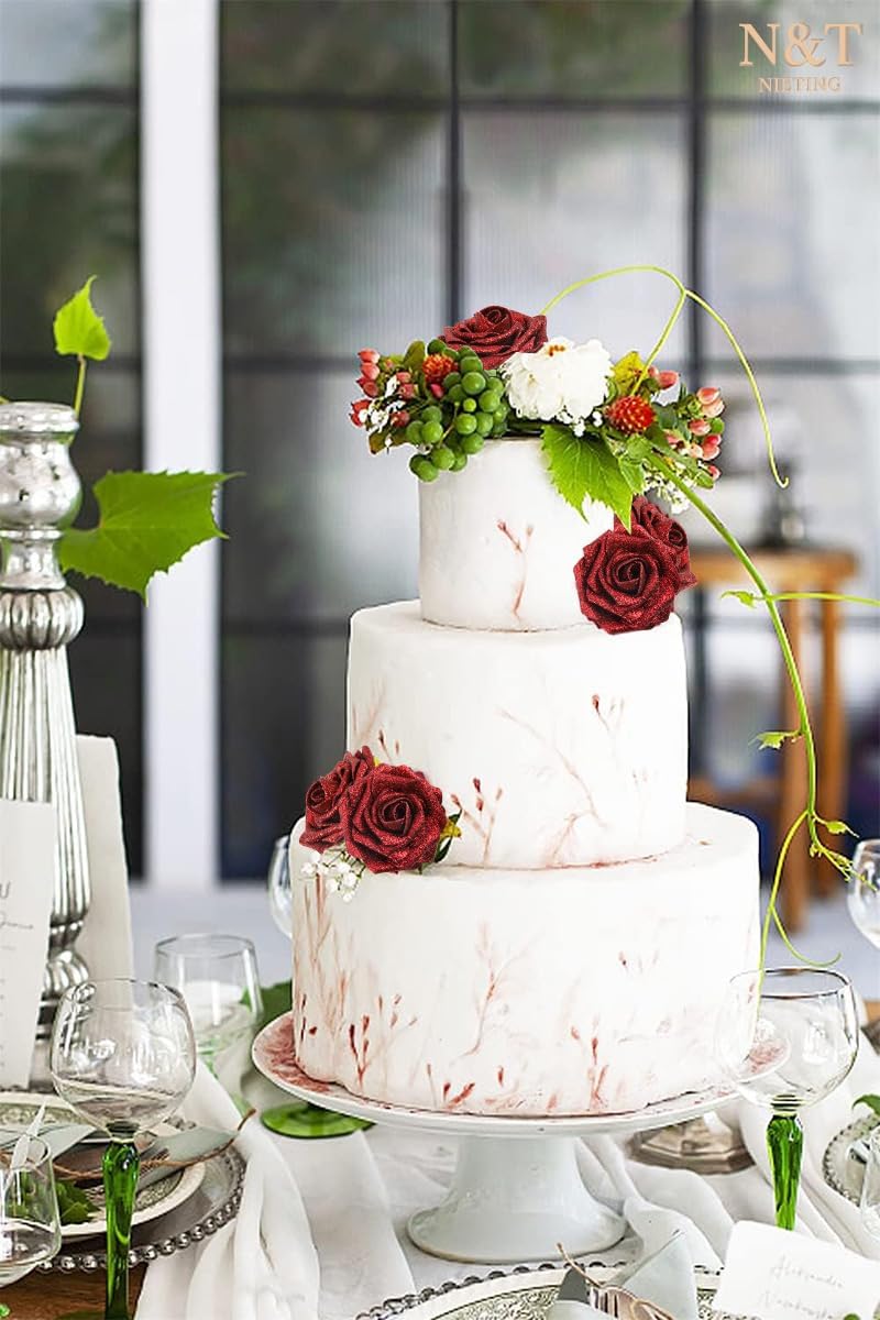 N&T NIETING Artificial Flowers Glowing Red Flowers Foam 50pcs Glitter Roses Real Looking Fake Roses with Stem for DIY Wedding Bouquets Centerpieces Bridal Shower Party Mother's Day Home Decorations