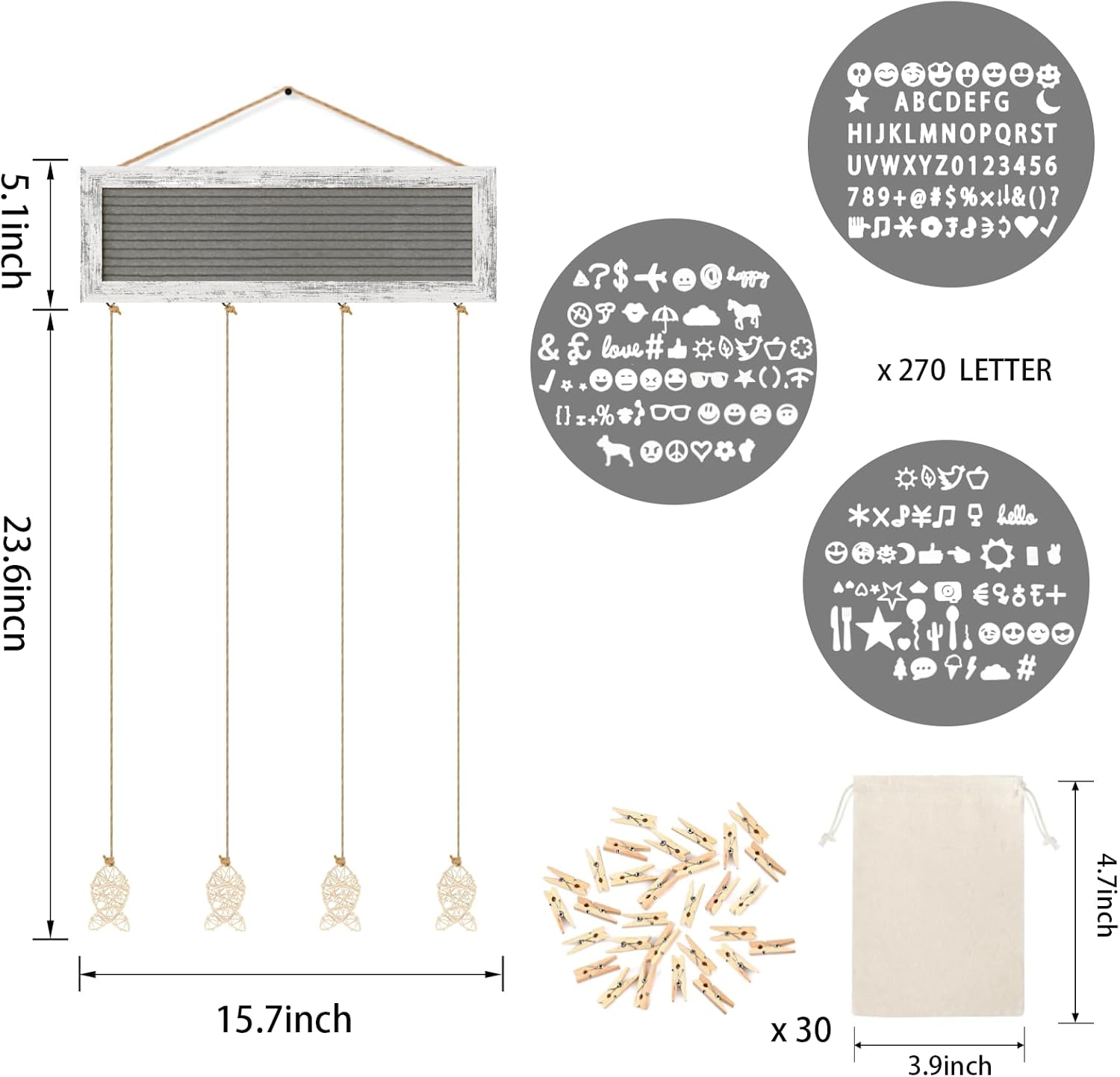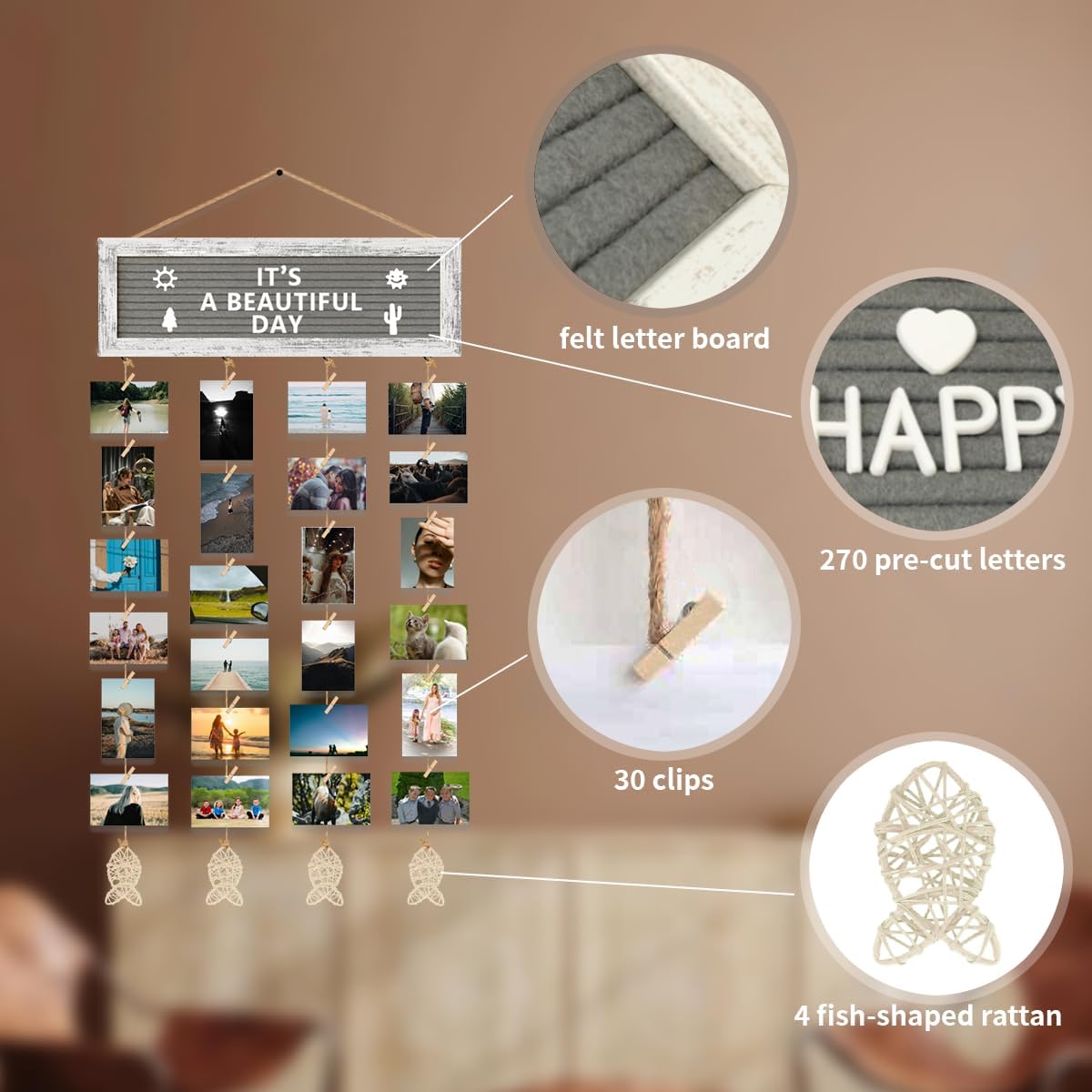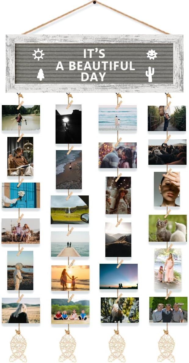 • DIY CREATIVE POLAROID PICTURE DISPLAY- This hanging photo display comes with a felt letter board, pre-cut 270 letters in a cloth bag, 30 clips, and 4 hemp ropes with fish-shaped rattan. Easily replace your favorite letters and symbols on the board, and adjust the length of the hemp rope, and the clips for changing the photo, a simple and creative way of DIY decoration.