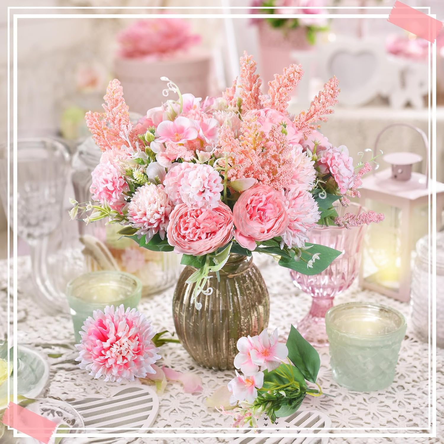 • Vibrant Splashes of Pink: this package includes 8 bouquets of pink silk flowers in 7 heads, offering a stunning array of vibrant pink shades to your decor; Each bouquet containing 7 prongs of 7 flowers, including 2 large peonies, 2 large ball chrysanthemums, 2 medium ball chrysanthemums, 1 large hydrangea, 3 foam fruit in the middle