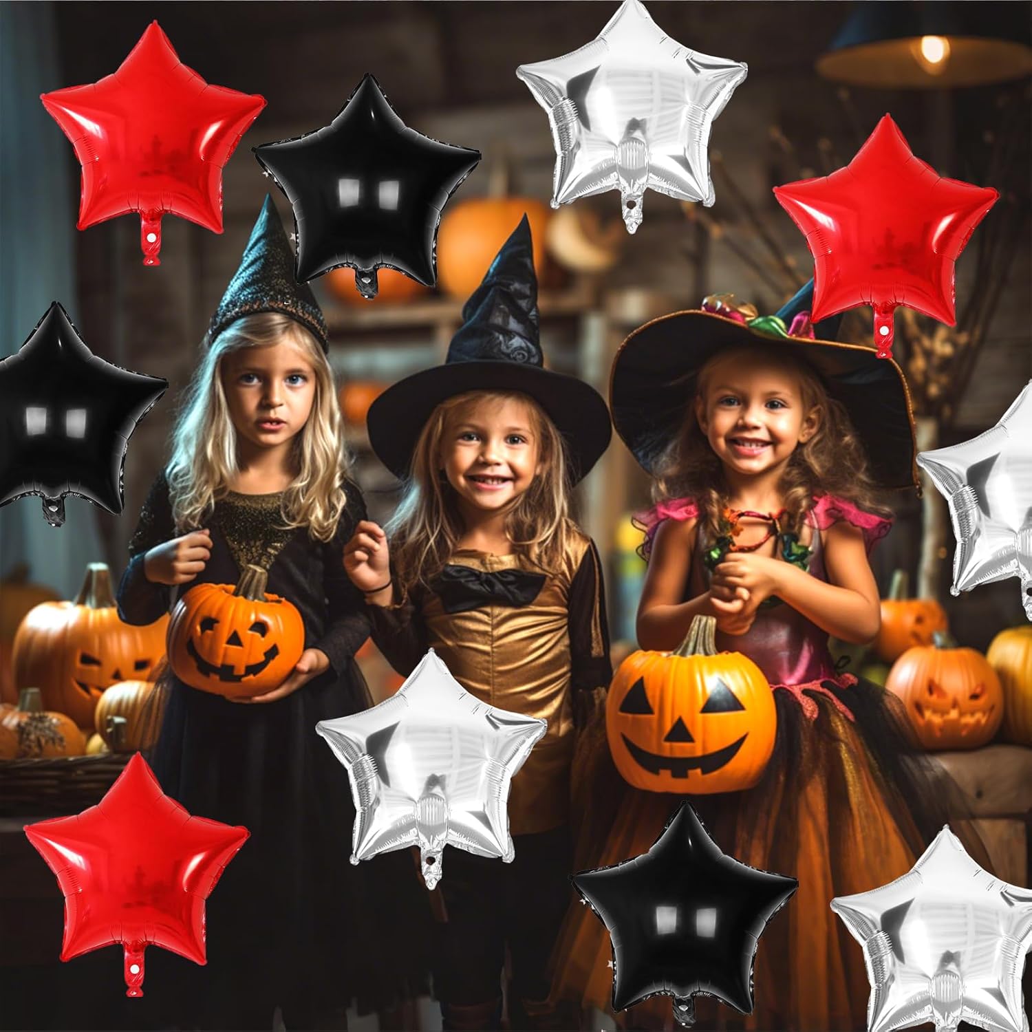 • Black Red Silver Stars Party Balloons: Pack of 12, designed with Giant 18 inch stars foil balloons, each balloons set comes with a straw and ribbon