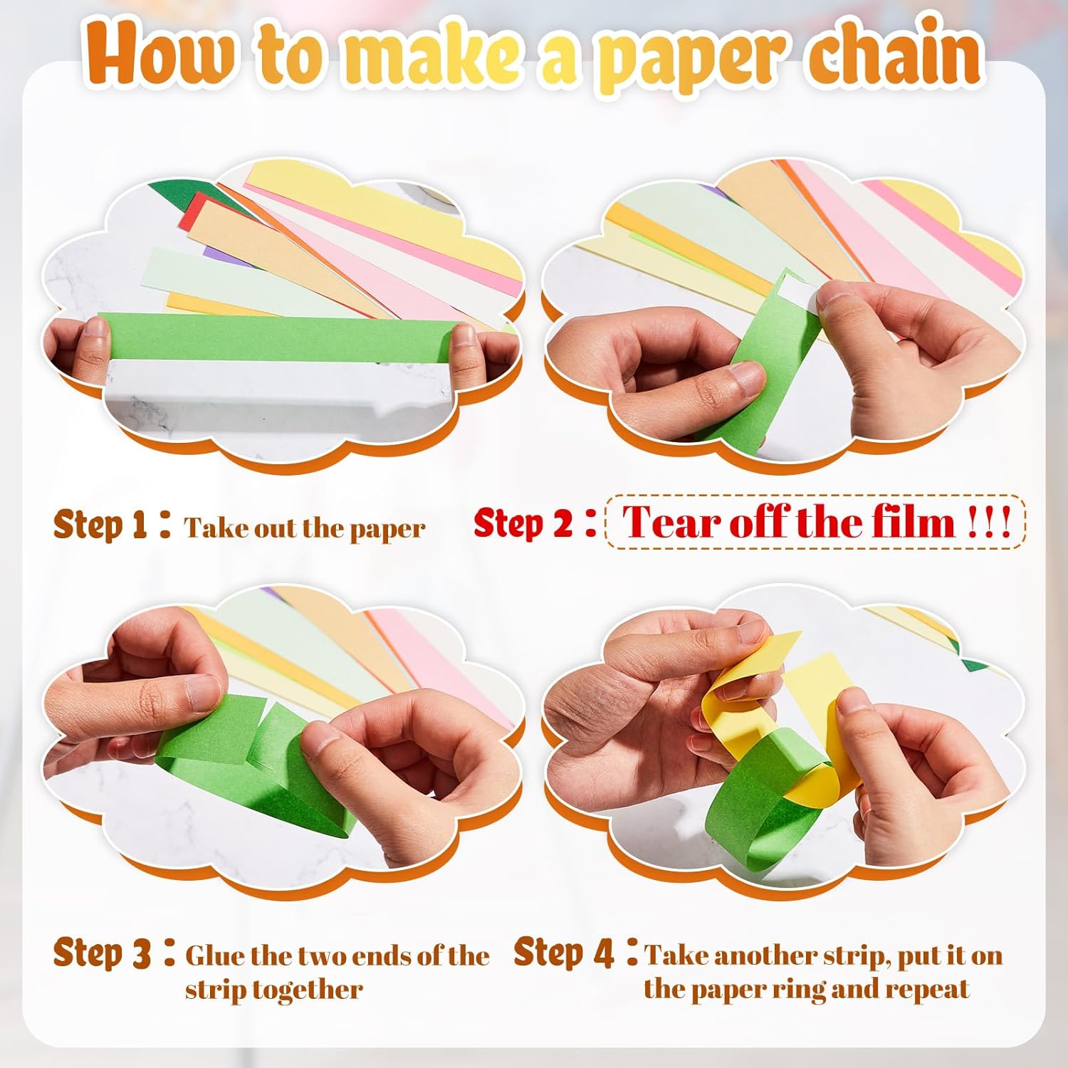 • Simple to Operate: using these colorful paper chain strips is very easy, you just need to stick the 2 ends of the paper together with the attached tape, match the color as you like, ring by ring, and you will get an exquisite and personalized handicraft, without complex or dangerous procedures