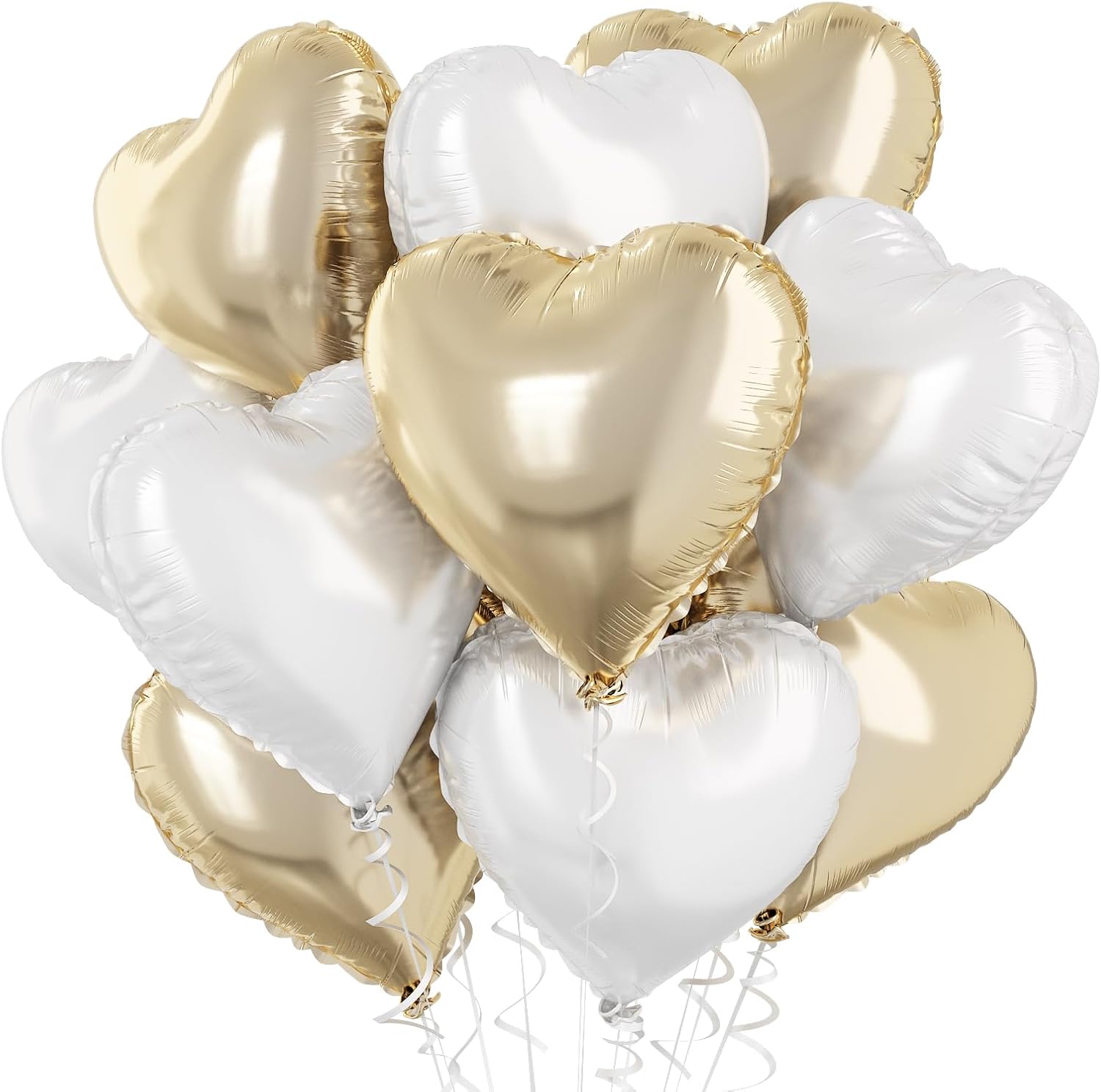 • Gold White Heart Balloons: There are 10pcs 18 inch heart foil balloons. Includes 5pcs 18 inch light gold heart foil balloons, 5pcs 18 inch white heart foil balloons and 1pc ribbons.