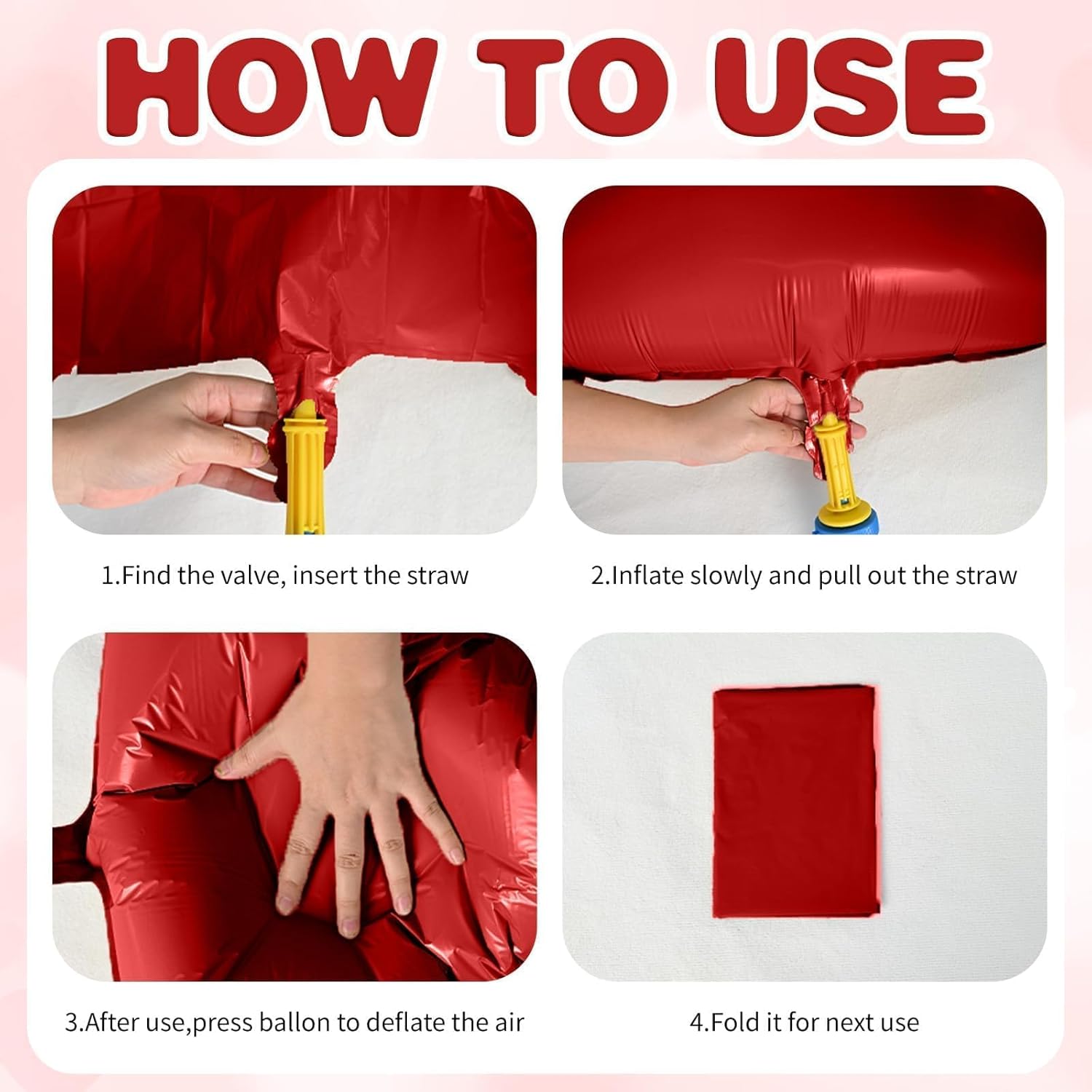 • Easy To Use:These red heart foil balloons are suitable for helium or air. Easy to inflate using the a straw or an air handheld pump. This heart foil balloon adopts self-sealing design, you only need to press the inflation port to seal it after finishing inflate. The balloons are reusable and can be folded up for next use after being deflated with a straw.