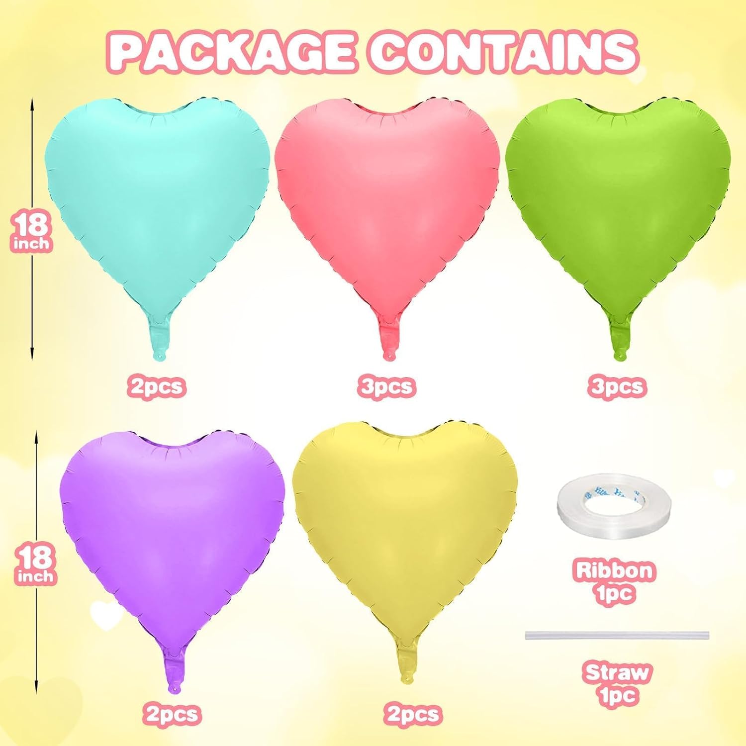• Pastel Heart Balloons:This 18 inches heart shaped balloons includes 2* macaron purple heart balloons, 2* macaron blue heart balloons, 3* macaron pink heart balloons, 3* macaron green heart balloons, 2* macaron yellow heart balloons,1* white ribbon, 1*straw, adding romance and warmth to your celebration. These large heart balloons will be the highlight of your party decorations, creating an atmosphere of love for everyone.