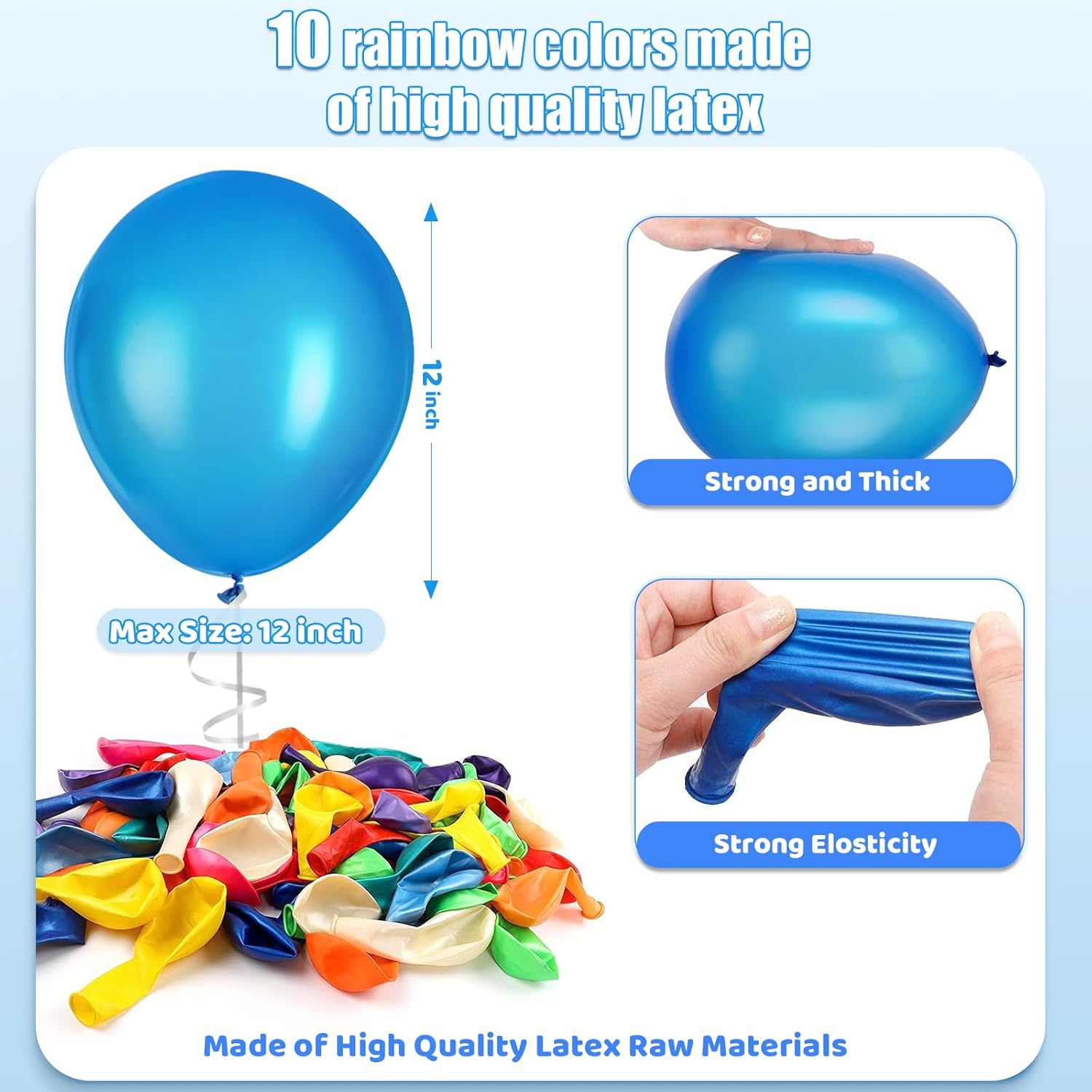 • 【Rainbow Party Balloons】 Each sets contains 120 pcs assorted party balloons of 12 inches 10 colors (red, orange, yellow, pink, dark green, light green, dark blue, light blue, dark purple, champagne gold) and 1pcs white ribbon (33 feet total). These multicolor balloons could make any dull space full of vitality and joy
