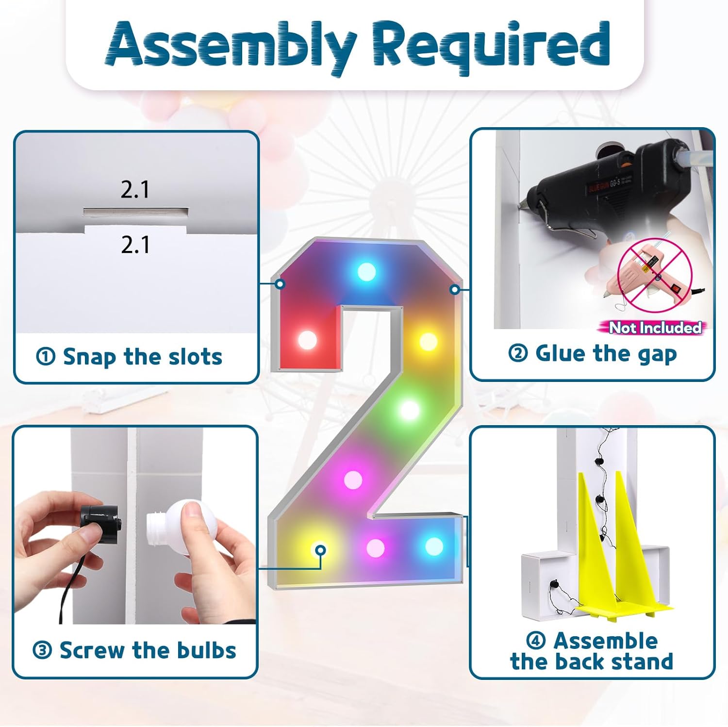 • Assembly Required. To assemble the light up numbers and letters, a hot glue gun is necessary. We have conveniently pre-cut the numbers into several pieces for your convenience. Simply consult the included instruction manual to easily assemble the impressive 4 ft tall and 3ft tall marquee numbers and letters using a hot glue gun.