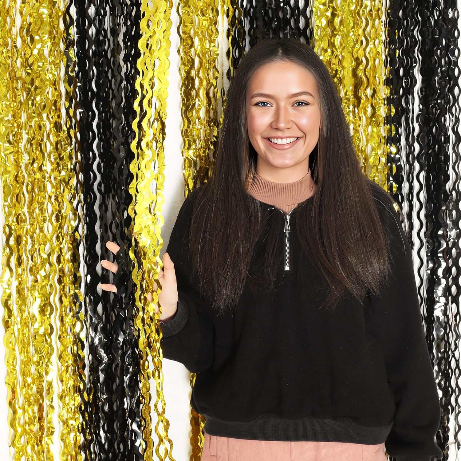 4 Pack Black and Gold Wavy Foil Fringe Curtains Pirthday Decorations,3.3 ft x 6.6 ft Metallic Foil Curtains Streamers for Party Photo Booth Props Background Decoration
