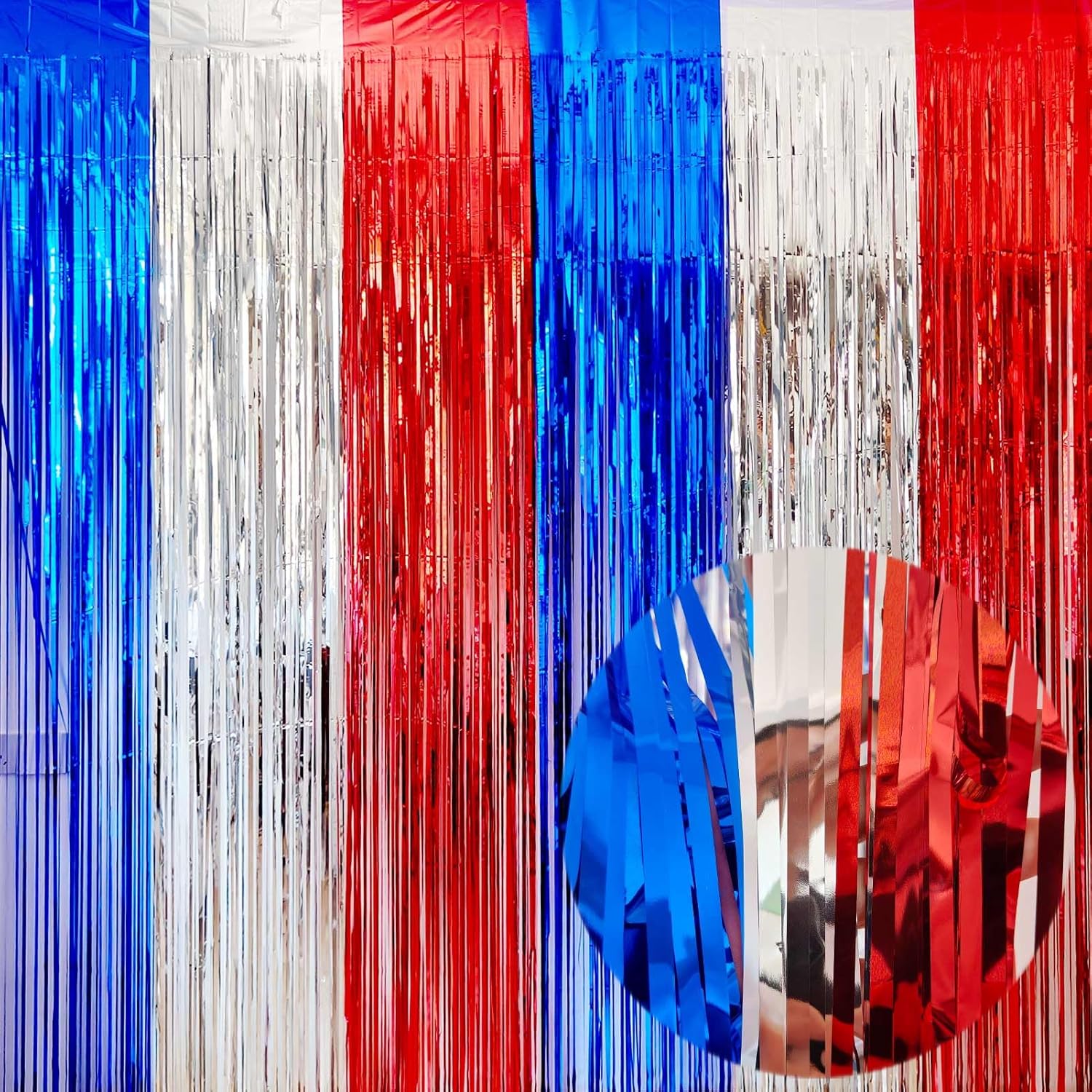 • PARTY BACKDROP DECORATIONS : The package includes 4packs red-silver-blue foil fringe backdrop curtains, each metallic tinsel curtain is 3.2ft(wide)×8.2ft(drop), wonderful accessories for decorating doorway, window and walls.