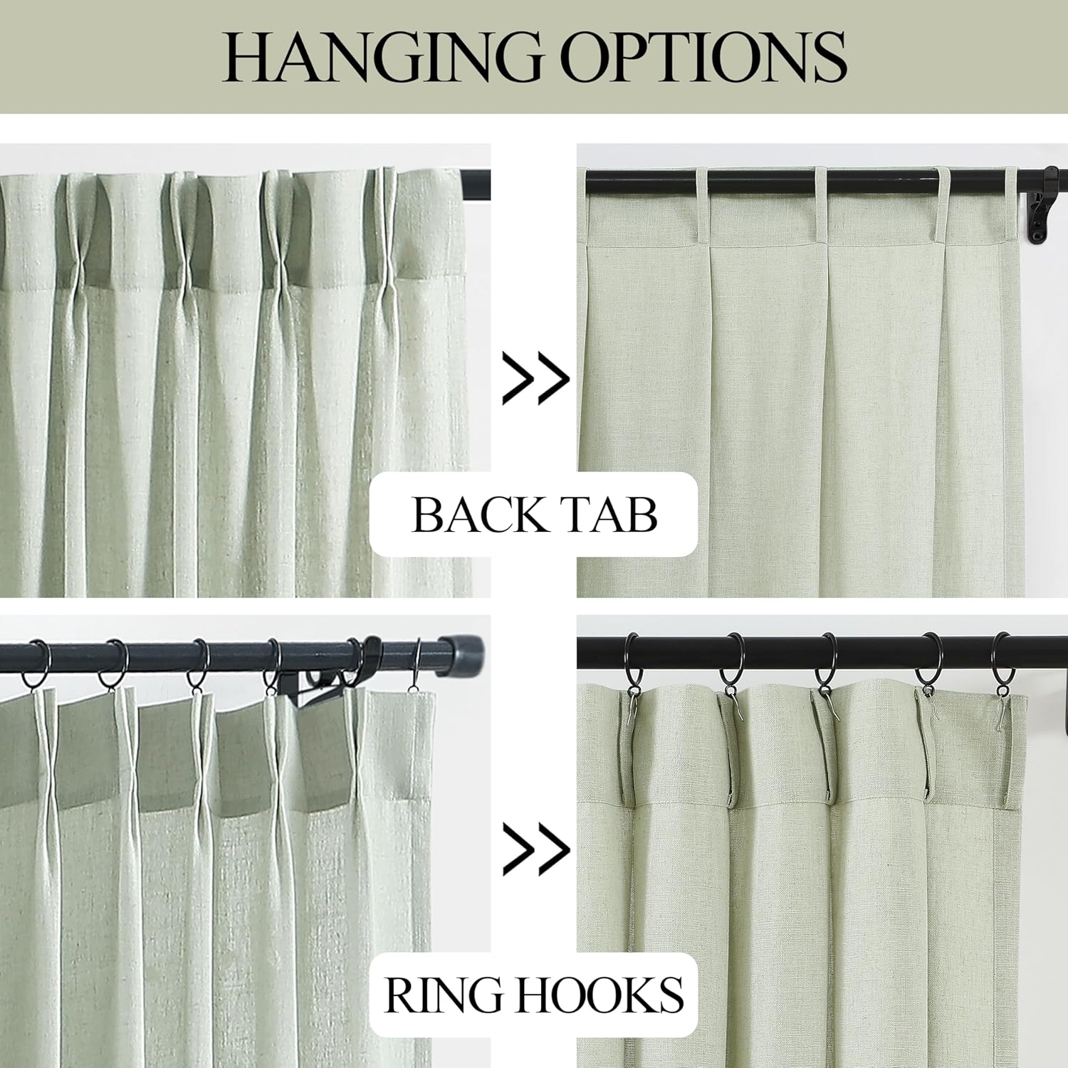 • Pinch Pleats Design:Each page green curtain panel with 7 pinch pleats generates modern and luxury feel.Linen curtains provide a natural,organic,and textured look that complements a variety of interior styles.By offering linen curtains in various colors,patterns,and lengths,we can cater to customers looking for a casual yet sophisticated window treatment.Hanging these pleated curtains to elevate your windows and increase the aesthetic value to any spaces,bedroom,living room,nursery,office,etc.