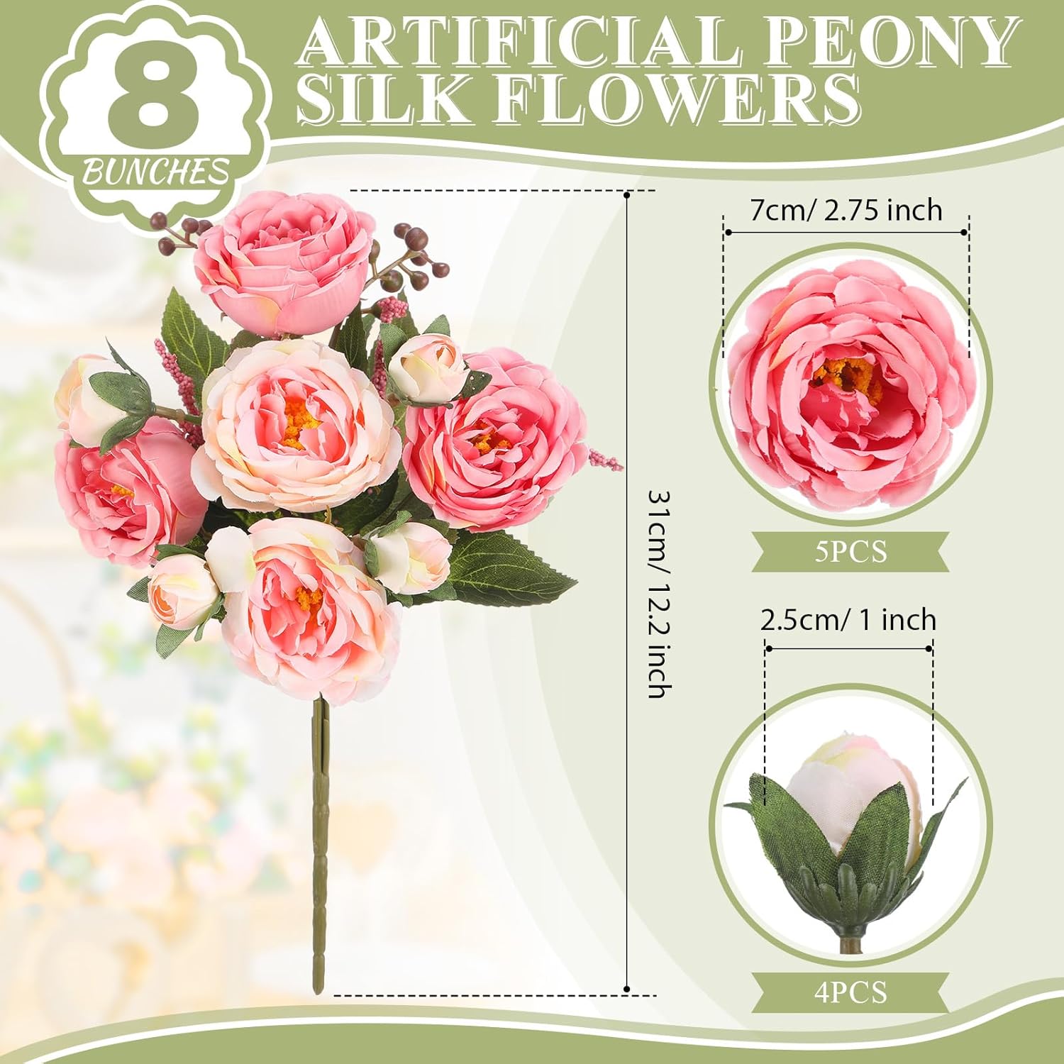 • Realistic Appearance: as you can see in the pictures, the silk peonies are pastel and sweet; The flowers and leaves are designed with clear textures, realistic and elegant, which will create a romantic and warm atmosphere for your house