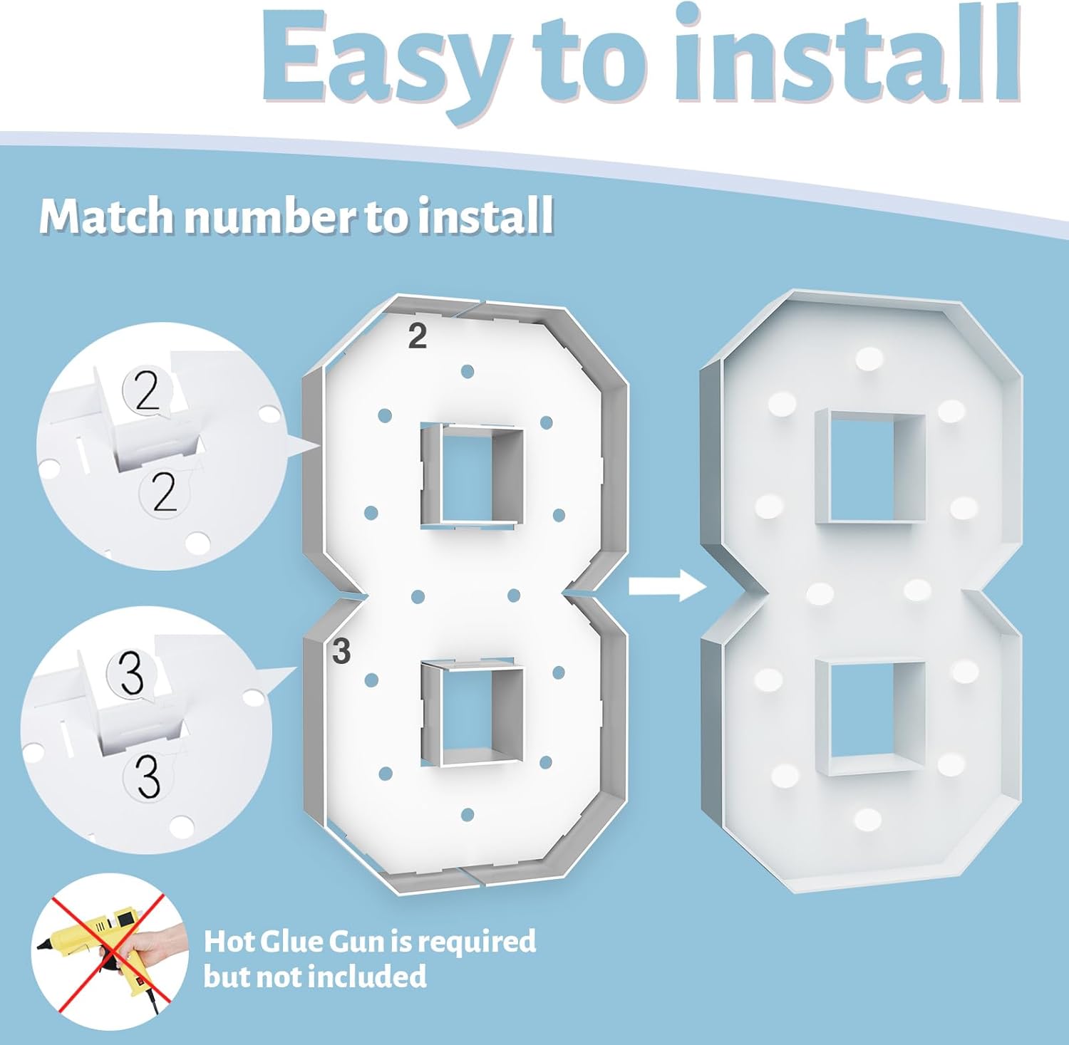 • ASSEMBLY REQUIRED: Marquee Light Up Letters consists of pre-cut frames with slots, the numerical markings in the mounting sequence will easily guide you through the matching, which requires a hot glue gun to bond and screw in the bulbs. Finish 4 feet tall checkbox letters (Note: Glue gun and batteries are not included)