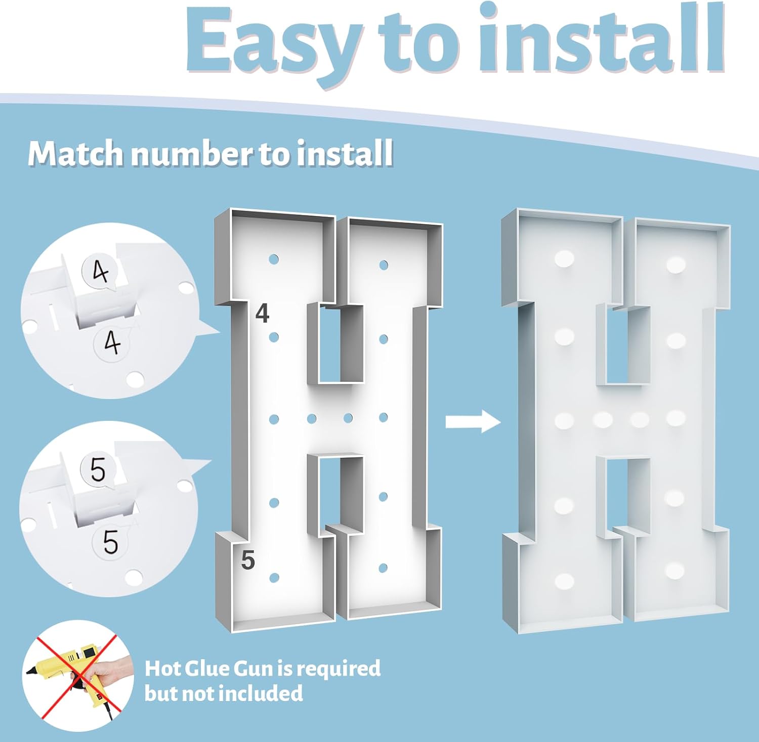 • ASSEMBLY REQUIRED: Marquee Light Up Letters consists of pre-cut frames with slots, the numerical markings in the mounting sequence will easily guide you through the matching, which requires a hot glue gun to bond and screw in the bulbs. Finish 4 feet tall checkbox letters (Note: Glue gun and batteries are not included)
