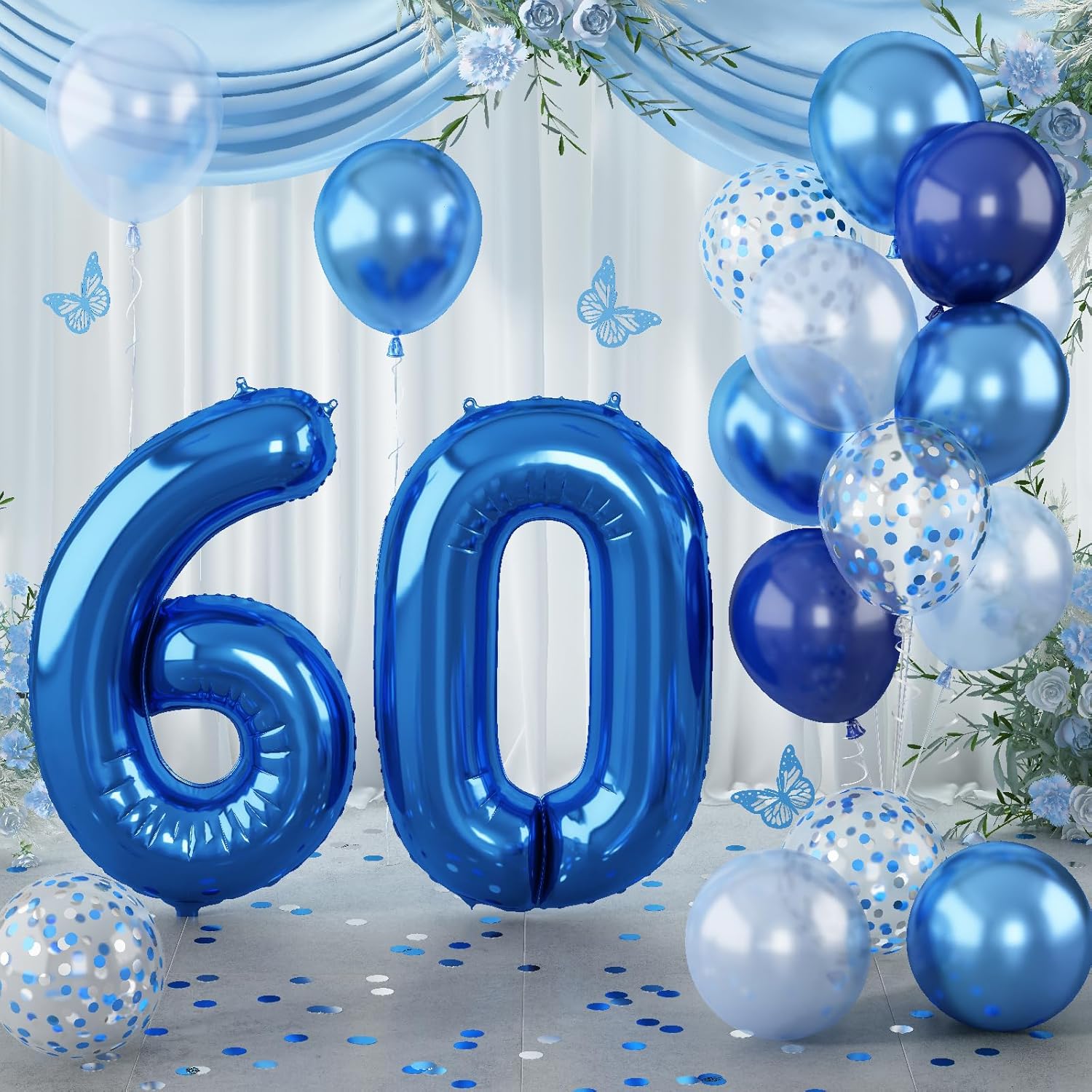 • ๐Ÿ’“ Dark Blue Number 60 Balloon: Our package included 40 inch foil number 60 balloon(2pcs), 12 inch metallic blue balloon(4pcs), blue silver confetti balloon(4pcs), pastel blue balloon(4pcs), Light Navy Blue Balloon(2pcs), 1pcs straw and 1 roll ribbon. Simply inflate the balloon using the straw, and you're ready to party! Navy blue number foil balloons are the best for men or women birthday party decoration.