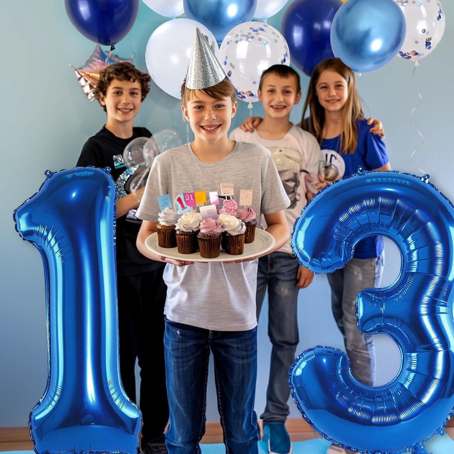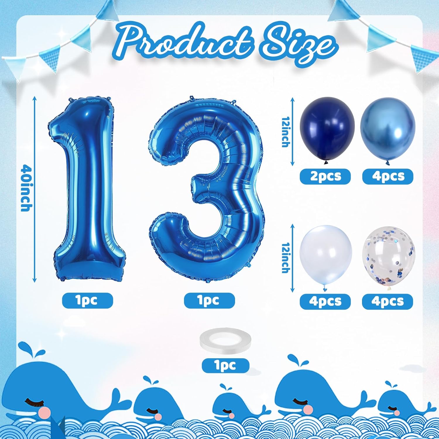 • ๐Ÿ’“ Dark Blue Number 13 Balloon: Our package included 40 inch foil number 13 balloon(2pcs), 12 inch metallic blue balloon(4pcs), blue silver confetti balloon(4pcs), pastel blue balloon(4pcs), Light Navy Blue Balloon(2pcs), 1pcs straw and 1 roll ribbon. Simply inflate the balloon using the straw, and you're ready to party! Navy blue number foil balloons are the best for girls or boys birthday party decoration.