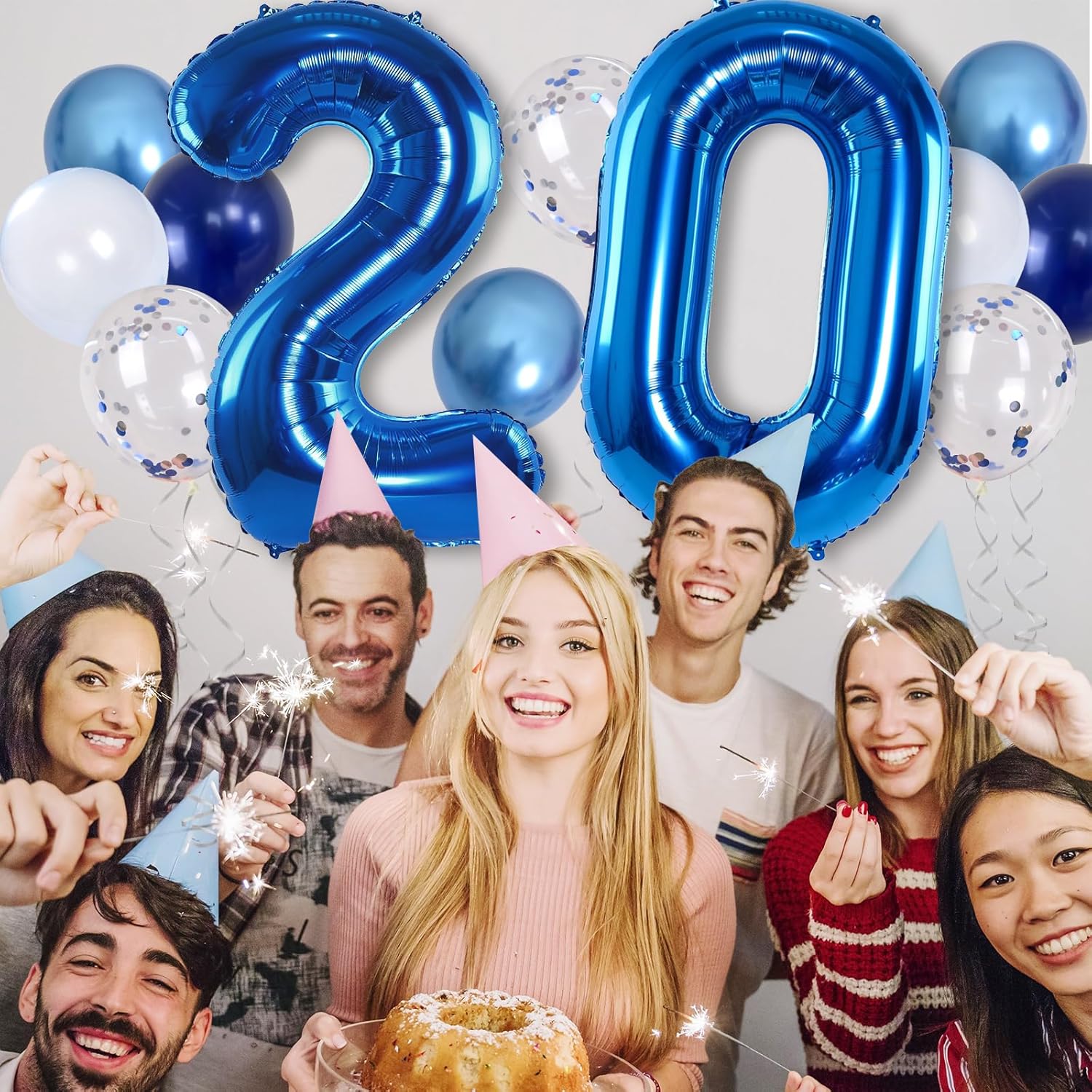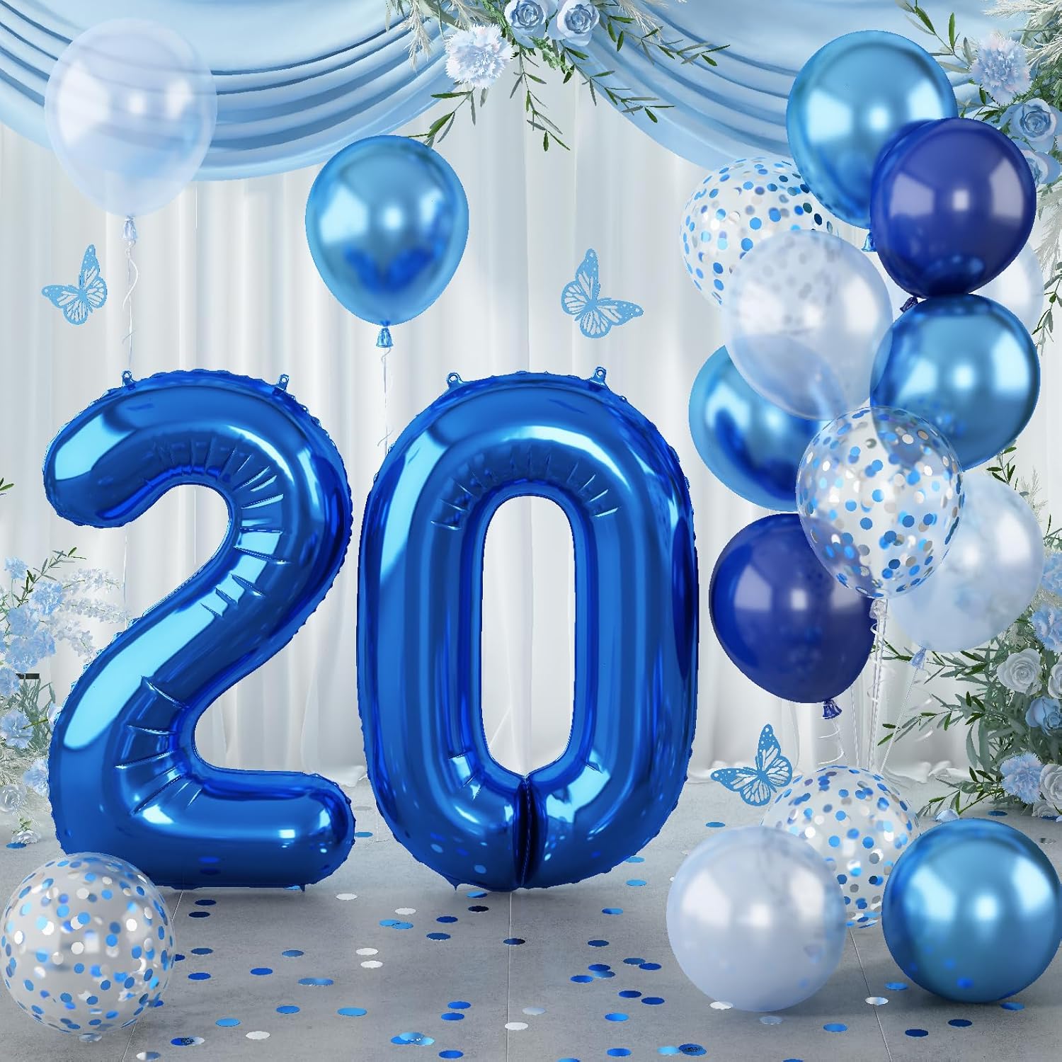 • ๐Ÿ’“ Dark Blue Number 20 Balloon: Our package included 40 inch foil number 20 balloon(2pcs), 12 inch metallic blue balloon(4pcs), blue silver confetti balloon(4pcs), pastel blue balloon(4pcs), Light Navy Blue Balloon(2pcs), 1pcs straw and 1 roll ribbon. Simply inflate the balloon using the straw, and you're ready to party! Navy blue number foil balloons are the best for men or women birthday party decoration.