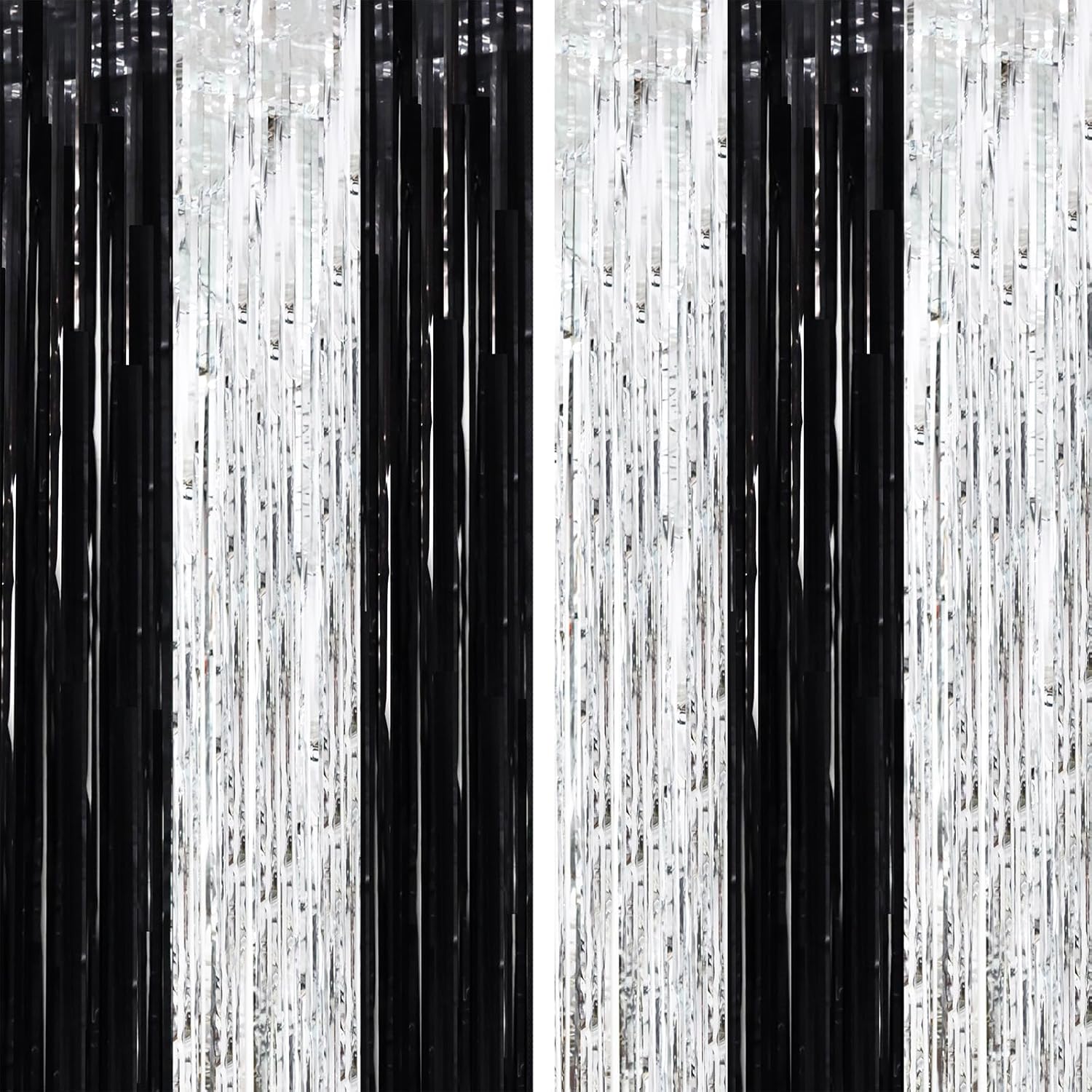 2 Pack Black and Silver Tinsel Foil Fringe Curtains, Black White Party Decorations, Metallic Tinsel Party Streamers Backdrop for New Years Birthday Christmas Graduation Decorations