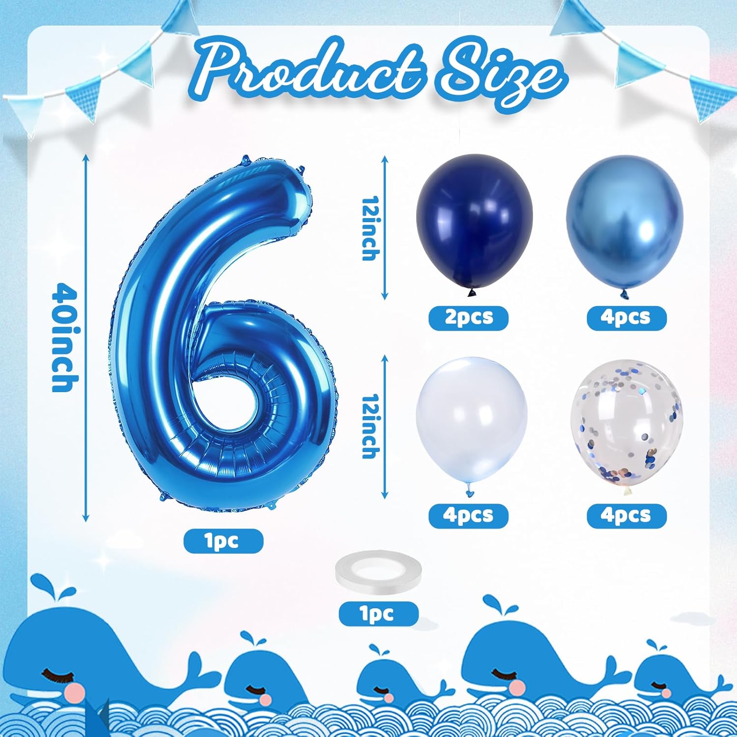 • ๐Ÿ’“ Dark Blue Number 6 Balloon: Our package included 40 inch foil number 6 balloon(1pcs), 12 inch metallic blue balloon(4pcs), blue silver confetti balloon(4pcs), pastel blue balloon(4pcs), Light Navy Blue Balloon(2pcs), 1pcs straw and 1 roll ribbon. Simply inflate the balloon using the straw, and you're ready to party! Navy blue number foil balloons are the best for girls or boys birthday party decoration.