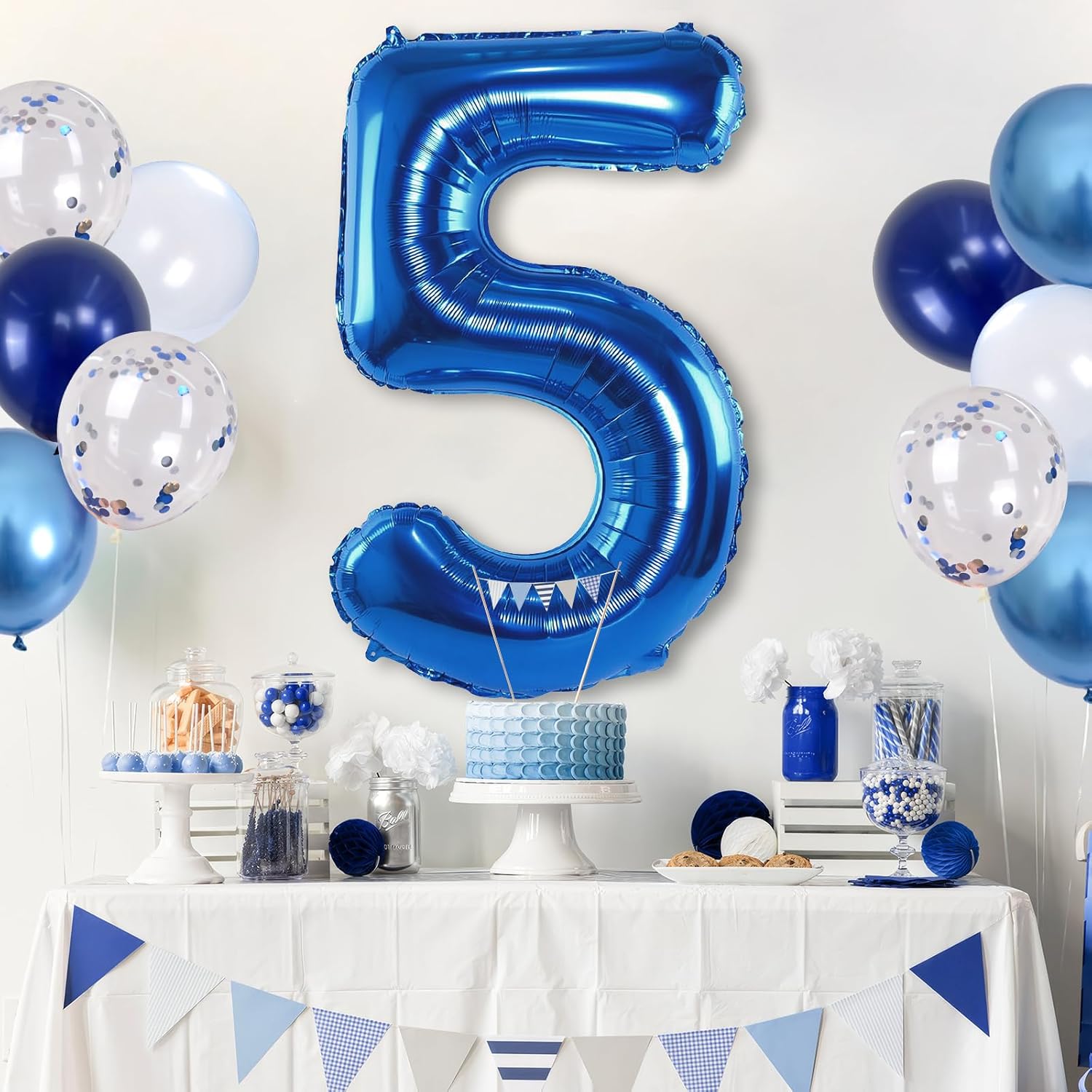 • ๐Ÿ’“ Dark Blue Number 5 Balloon: Our package included 40 inch foil number 5 balloon(1pcs), 12 inch metallic blue balloon(4pcs), blue silver confetti balloon(4pcs), pastel blue balloon(4pcs), Light Navy Blue Balloon(2pcs), 1pcs straw and 1 roll ribbon. Simply inflate the balloon using the straw, and you're ready to party! Navy blue number foil balloons are the best for girls or boys birthday party decoration.