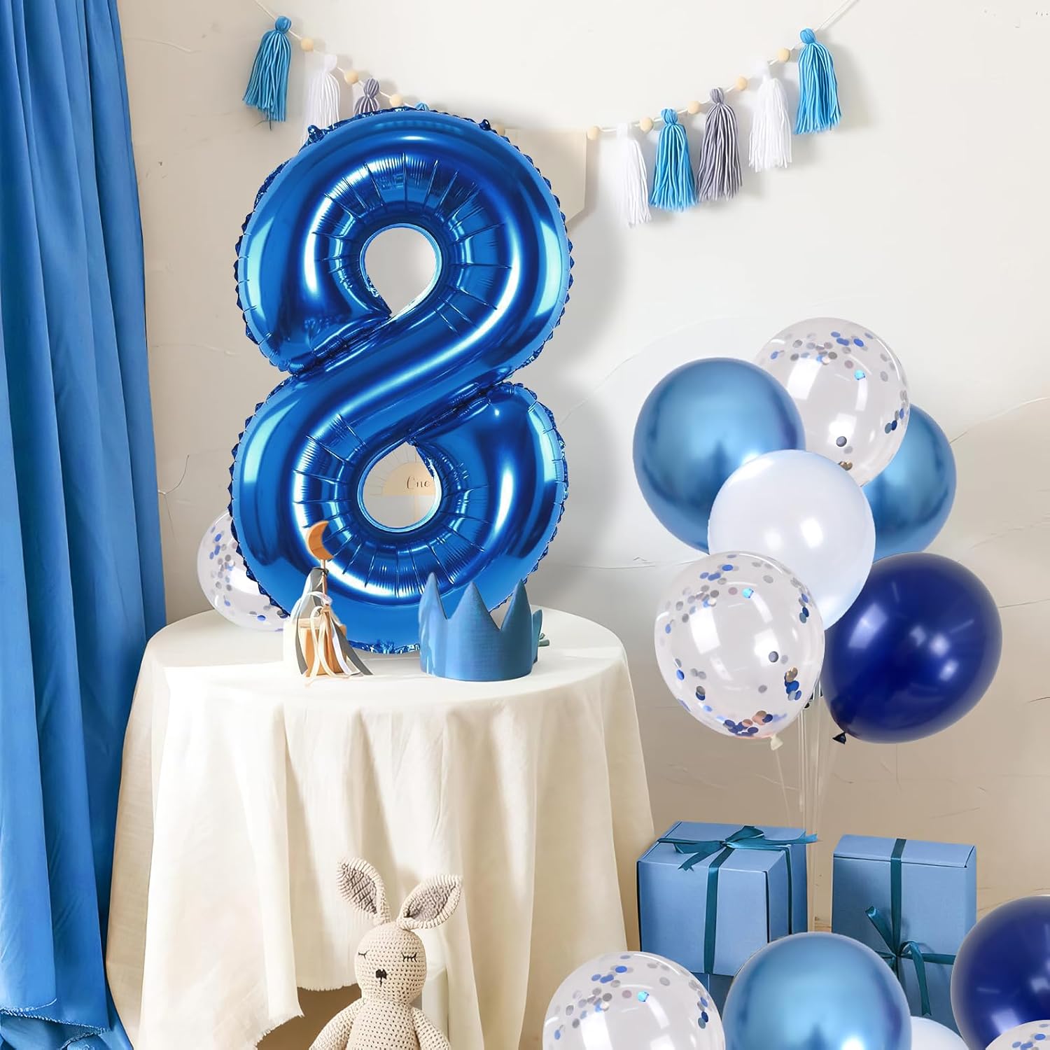 • 💓 Dark Blue Number 8 Balloon: Our package included 40 inch foil number 8 balloon(1pcs), 12 inch metallic blue balloon(4pcs), blue silver confetti balloon(4pcs), pastel blue balloon(4pcs), Light Navy Blue Balloon(2pcs), 1pcs straw and 1 roll ribbon. Simply inflate the balloon using the straw, and you're ready to party! Navy blue number foil balloons are the best for girls or boys birthday party decoration.