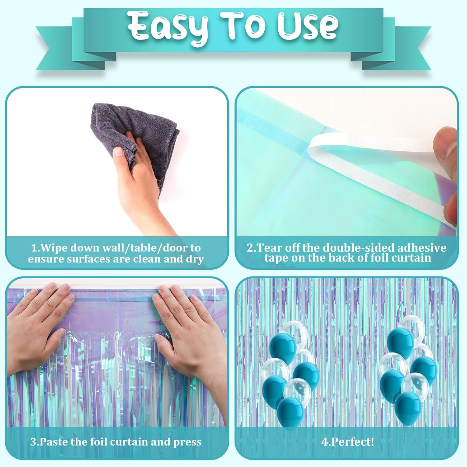 • How to Set up: Wipe down wall/table/door, ensure surfaces are clean and dry, tear off the double-sided adhesive tape, paste the foil backdrop curtains and press. Hang each individual tinsel fringe curtains in different locations for a fuller effect