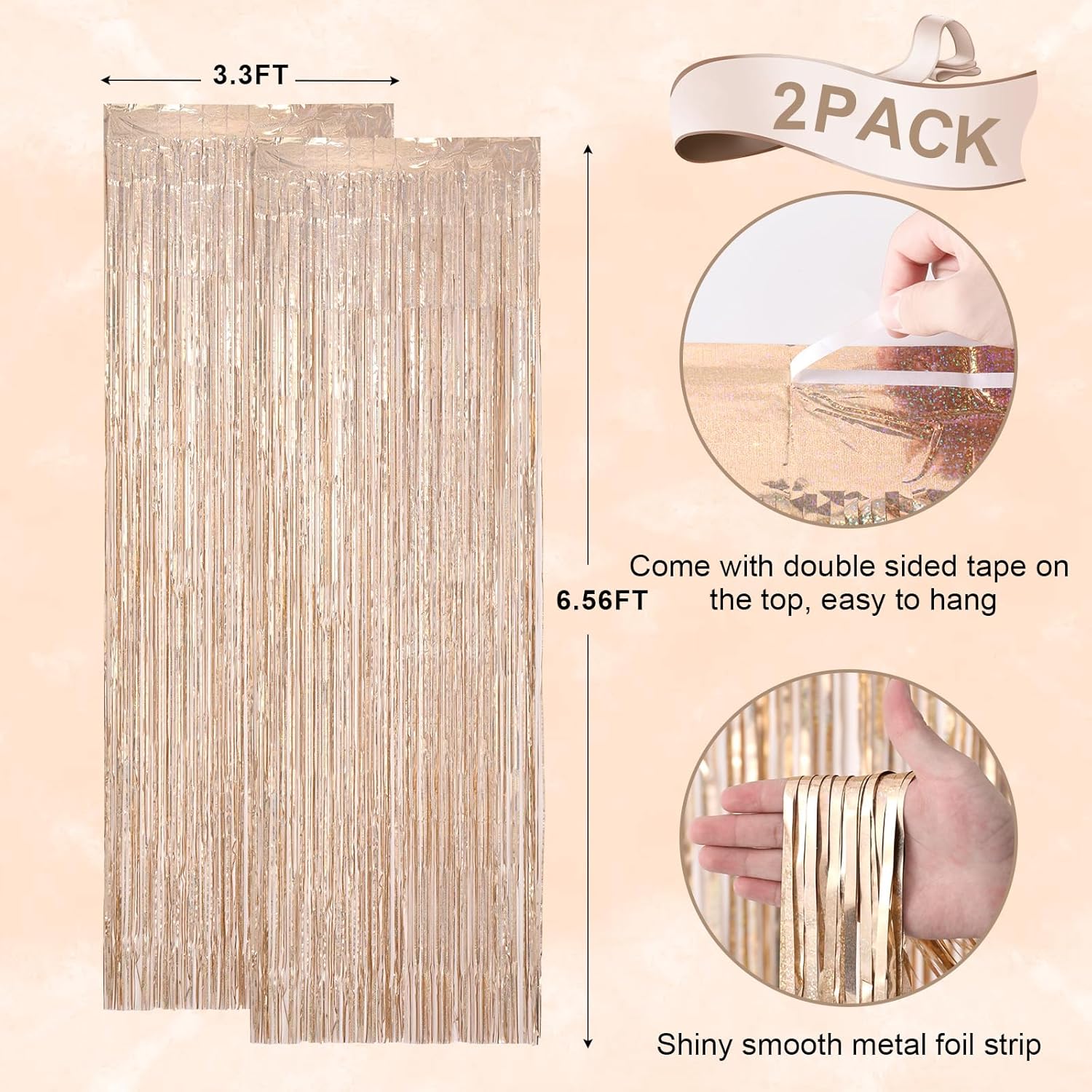 • Stunning Decorative Set: You'll receive 2 pcs champagne gold foil fringe backdrop curtains, each measuring 3.28 ft (wide)×6.56 ft (drop). Enough length foil fringe curtains backdrops are perfect for the door or wall to create an impressive decoration