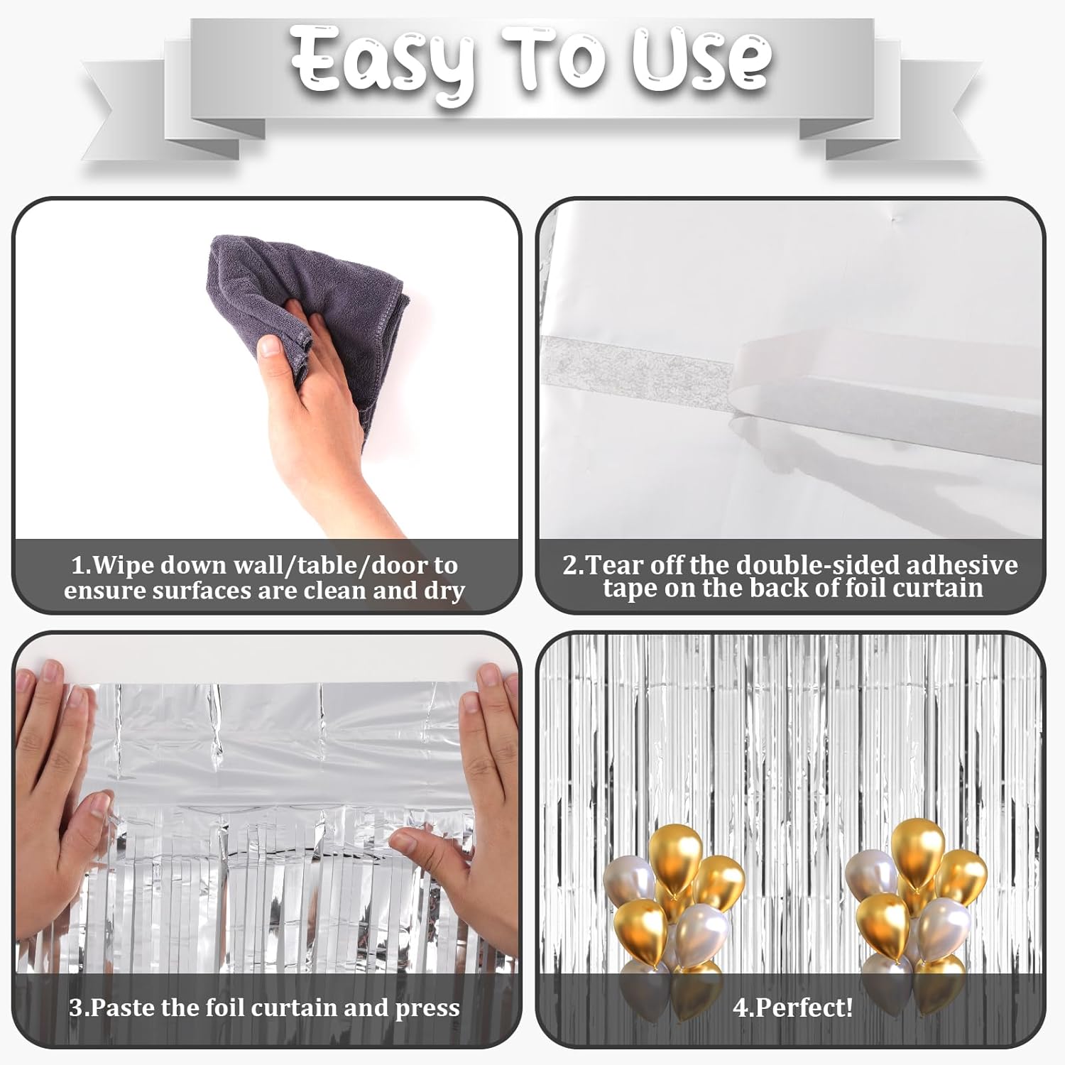 • How to Set up: Wipe down wall/table/door, ensure surfaces are clean and dry, tear off the double-sided adhesive tape, paste the foil backdrop curtains and press. Hang each individual tinsel fringe curtains in different locations for a fuller effect
