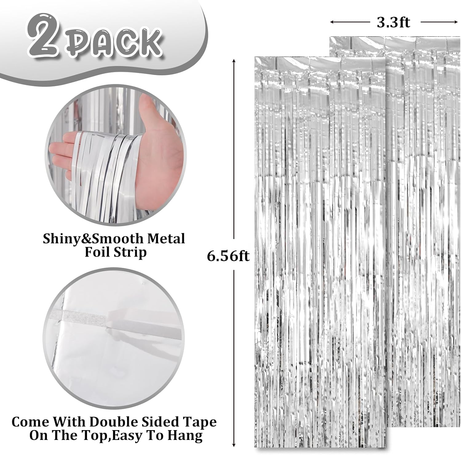 2 Pack Silver Tinsel Foil Fringe Curtains, Silver Party Decorations, Metallic Tinsel Party Streamers Backdrop for Birthday Baby Shower Graduation Wedding Bachelorette Party Decorations