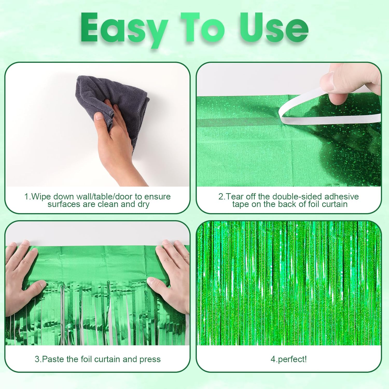 • Stunning Decorative Set: You'll receive 2 pcs laser green foil fringe backdrop curtains, each measuring 3.28 ft (wide)×6.56 ft (drop). Enough length foil fringe curtains backdrops are perfect for the door or wall to create an impressive decoration