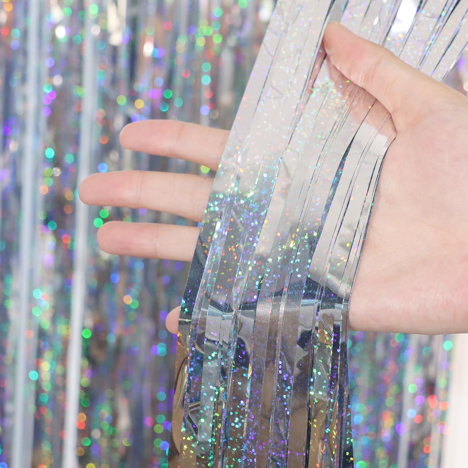 • Stunning Decorative Set: You'll receive 2 pcs laser silver foil fringe backdrop curtains, each measuring 3.28 ft (wide)×6.56 ft (drop). Enough length foil fringe curtains backdrops are perfect for the door or wall to create an impressive decoration