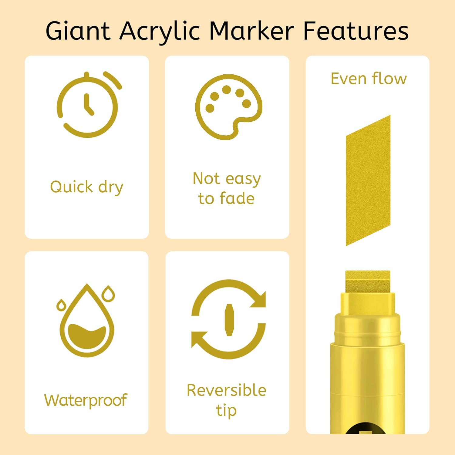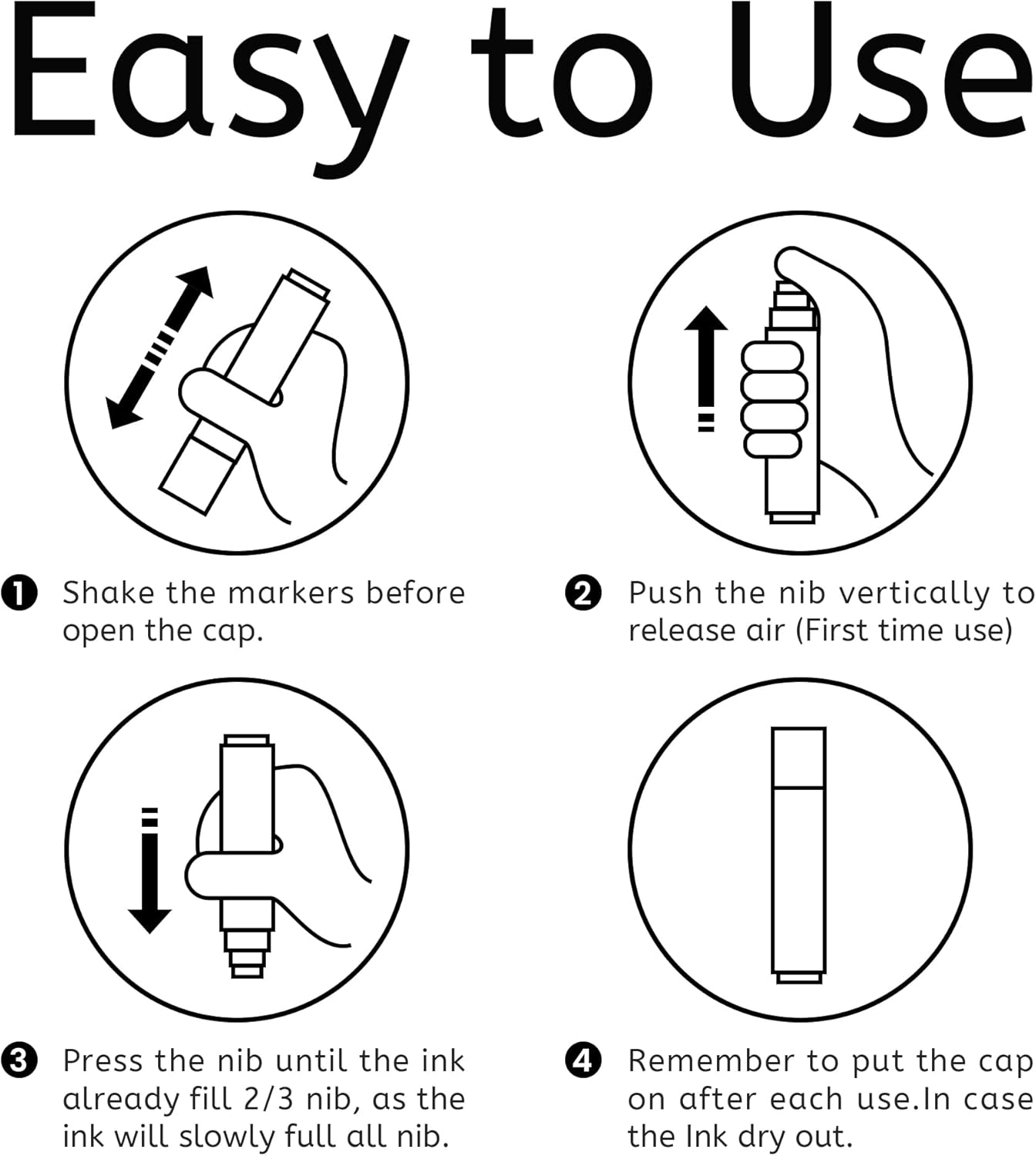 • Instruction: For the acrylic paint markers please shake the marker before use, and press the nib up and down or several times until jumbo marker tip fills with ink(first time use). Please cover the cap after use, in case the Ink dries out.
