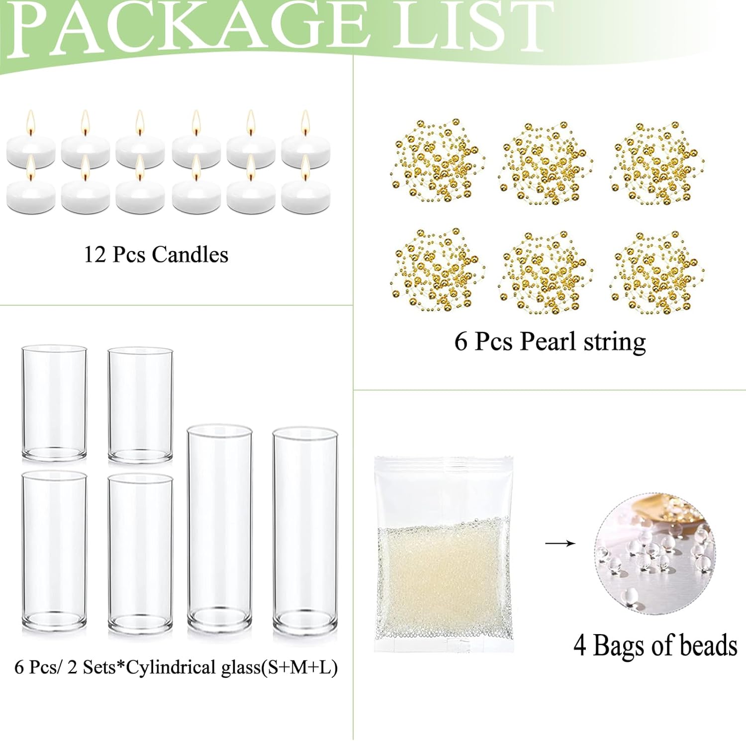 • Size Details: The glass vases come in three different sizes, 2.56" x 5", 2.56" x 6", 2.56" x 8", the size of the floating candle is about 1.87"x 0.77"; And each Artificial Pearl string is approx. 51.18" in length