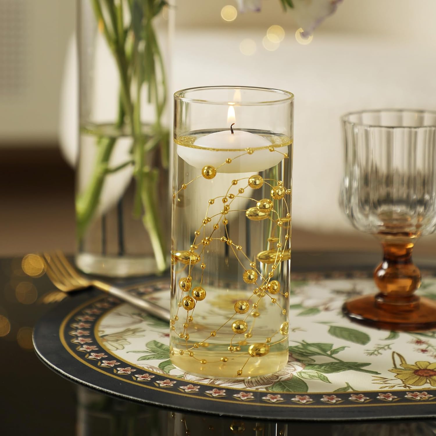 • Easy to Operate: Put the pearls strings into the glass cylinder vase,and then place floating candles on the water and light up to get a delicate and beautiful desktop center decoration