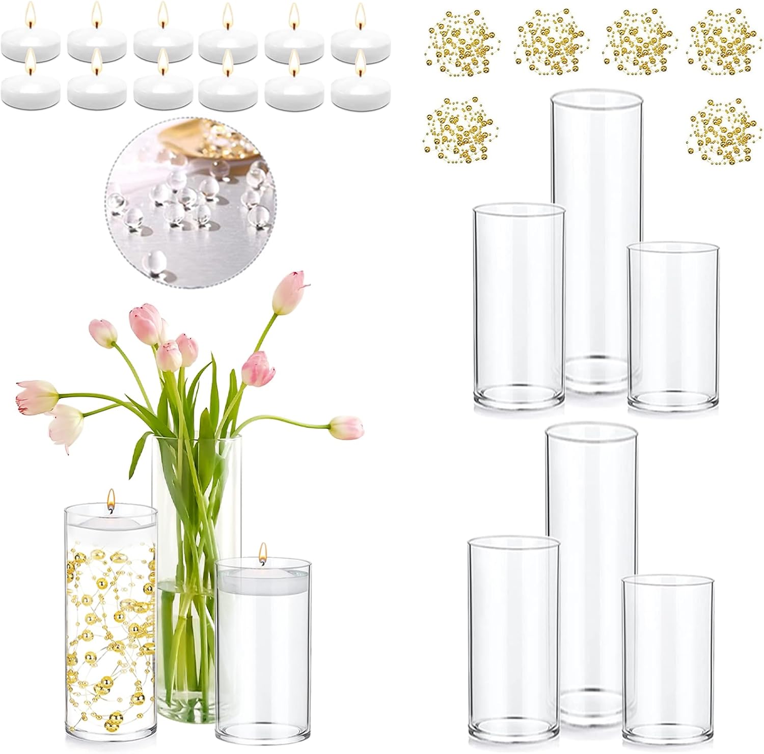 Set of 6 Glass Cylinder Vases for Centerpieces with 4 Pack Vase Filler 6 Pearl String 12 White Floating Candles for Centerpieces, Center Pieces for Table Wedding Party Home Decor 5, 6, 8 Inch