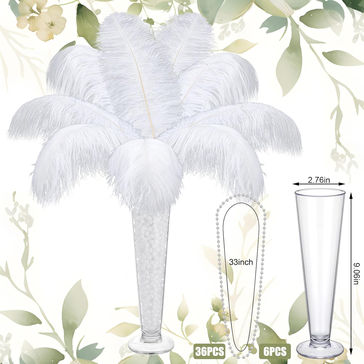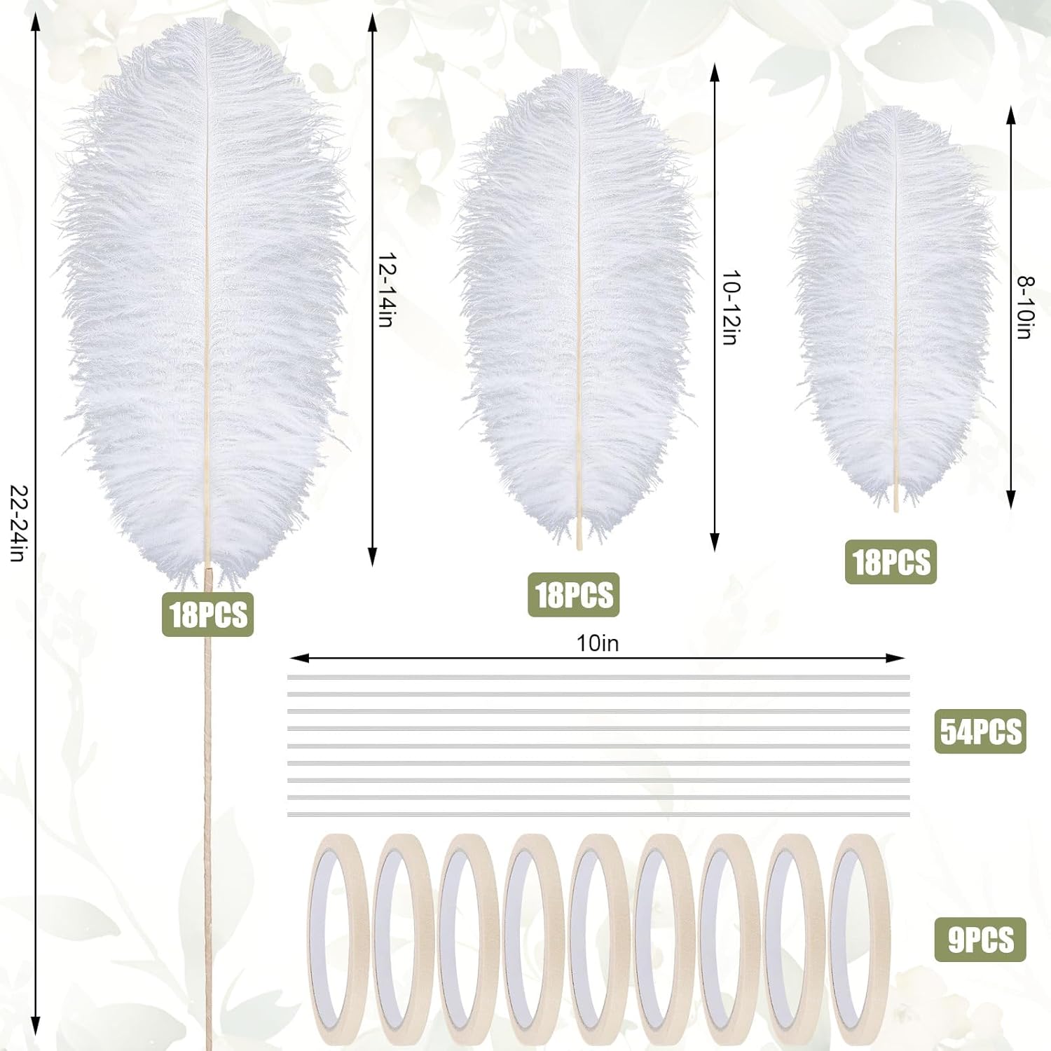 • Included Components : 54 white ostrich feathers for vases, 54 plastic hose sticks, 6 plastic vases, 9 rolls of white tape, 36 white beaded necklaces in bulk 54 white ostrich feathers for vases, 54 plastic hose sticks, 6 plastic vases, 9 rolls of white tape, 36 white beaded necklaces in bulk