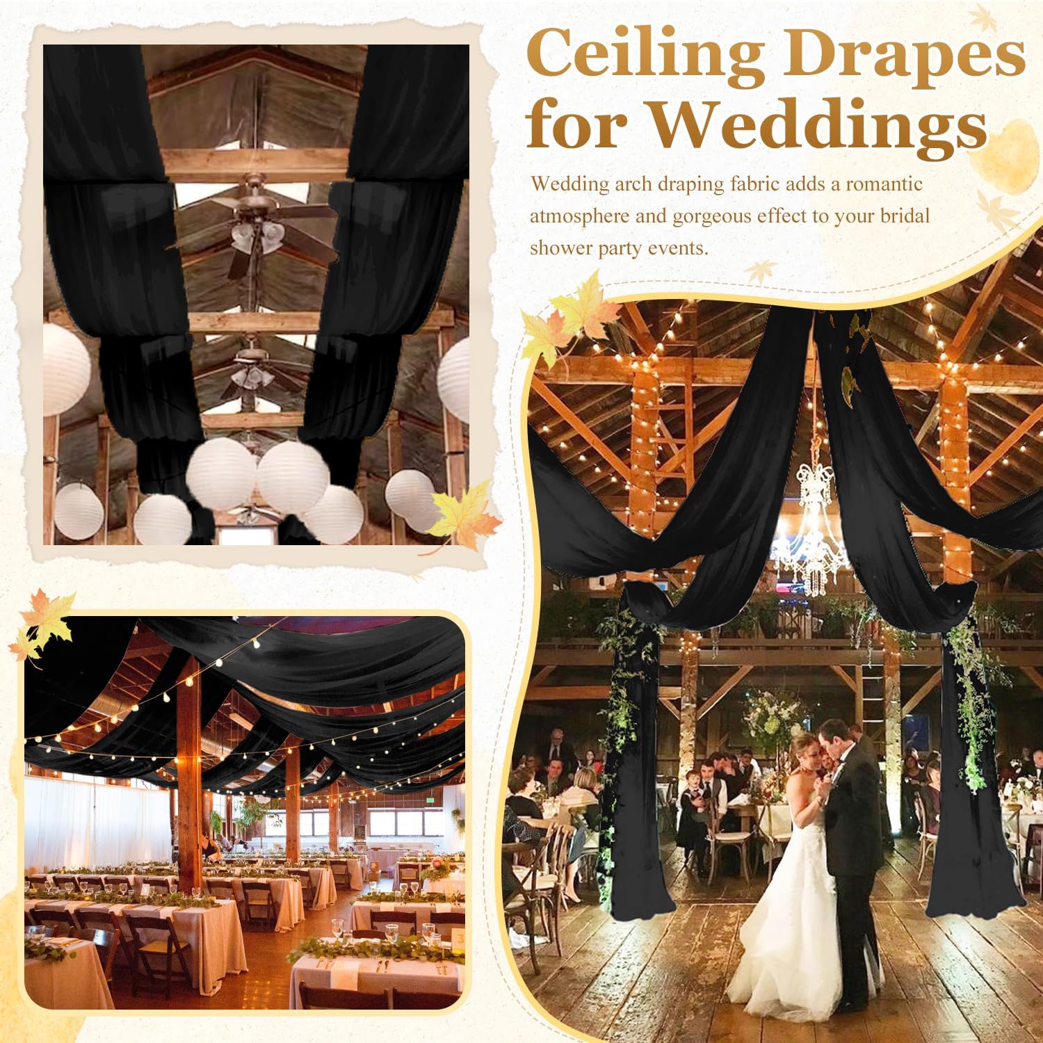 MODFUNS Black Ceiling Drapes Wedding Arch Drapery 5x30ft 4 Panels Chiffon Sheer Curtain Drapes Rustic Fabric for Wedding Party Reception Decoration
